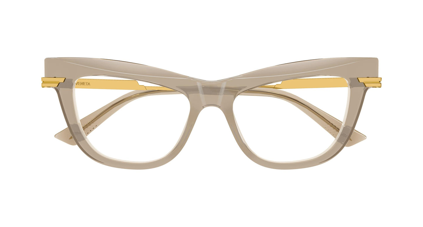 Modelo femenino con forma de ojo de gato y materiales combinados caracterizado por su frontal de acetato anguloso y grueso. Varillas metálicas superligeras decoradas con la icónica franja doble. Logotipo Bottega Veneta en la varilla. Terminal de acetato para mayor comodidad.