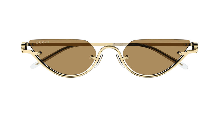 Pequeña y delicada construcción de media montura de metal con una innovación exclusiva del logotipo rotado en posición vertical. Diseño ‘cat eye’ estrecho y femenino de metal. Innovación del imagotipo gg vertical. Paleta de colores brillantes combinada con lentes comerciales con colores exclusivos con una referencia guccissima en la gama.