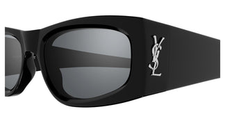 Ny cat-eye monogrammodel med bløde acetatlinjer, tilgængelig til mænd og kvinder med spadestænger. Det ikoniske YSL-mærke er integreret i begge sideflapper i form af en metallisk udsmykning, der fremhæver modellen og fremstår tydeligt på begge stænger.