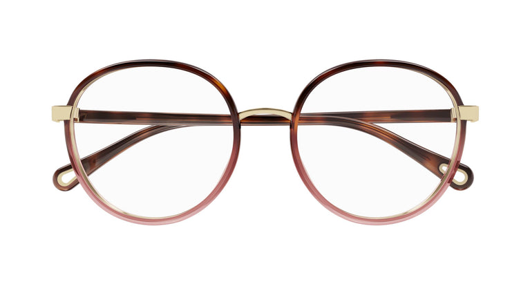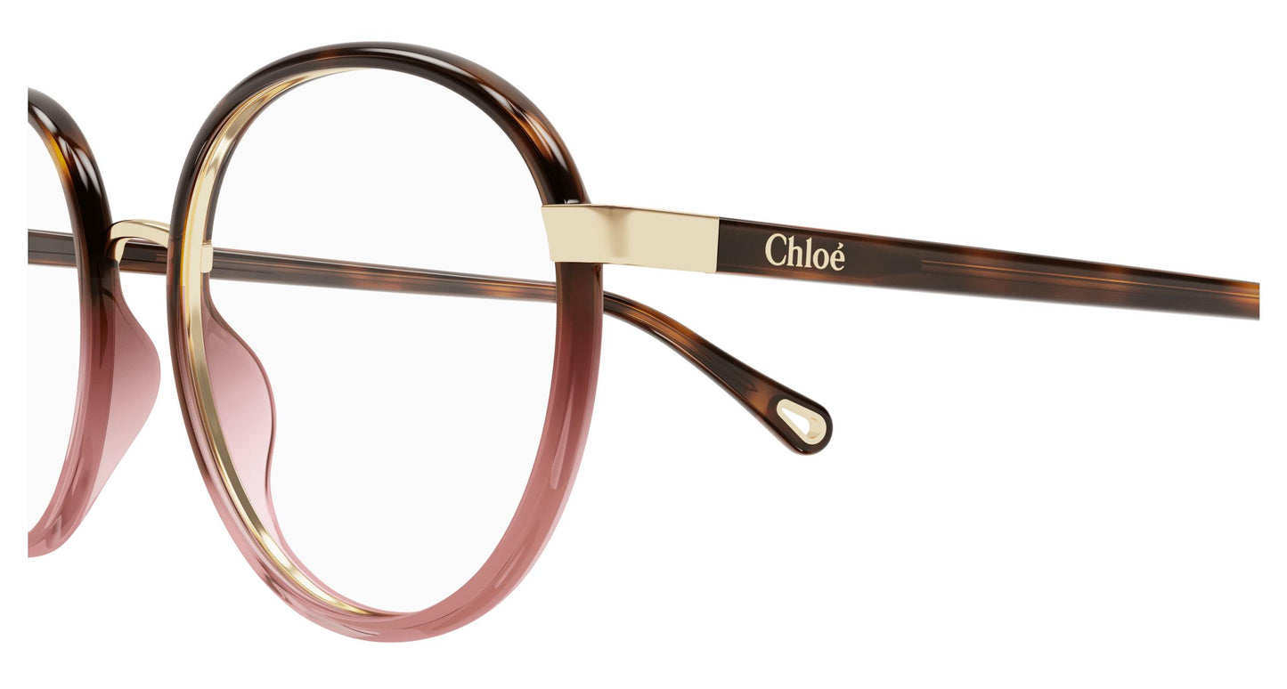 Muntura rodona de materials combinats amb cèrcols de plàstic de color degradat i varetes d'acetat degradat. El pont de metall i la urpa de metall daurat uneixen el cèrcol frontal amb la vareta. Logotip estampat en calent a la vareta esquerra. L'icònic tall en forma de llàgrima serveix com una forma estètica i funcional de fixar les «ulleres joia» Chloé a la terminació de les varetes, realçades amb el logotip gravat.