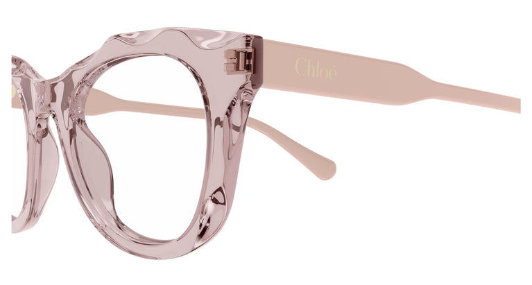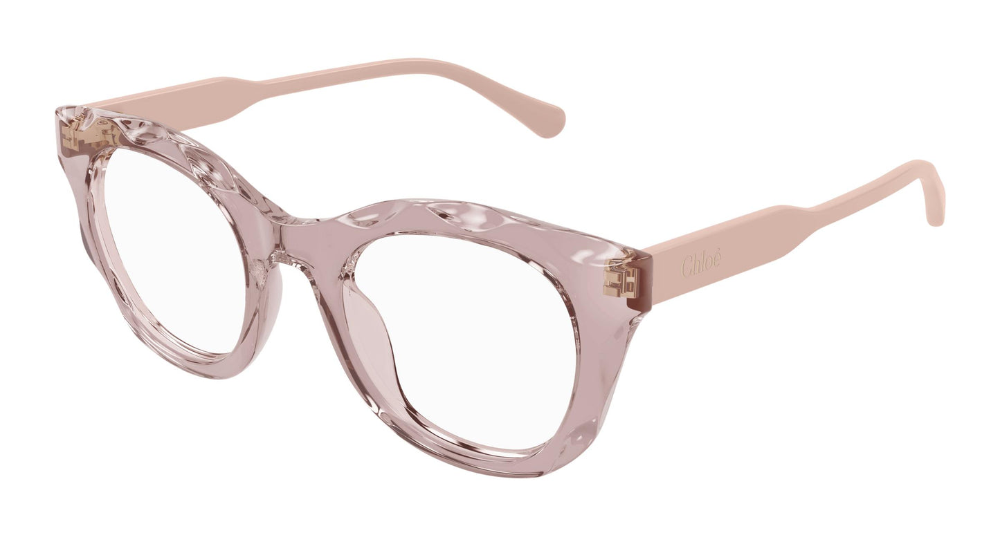 Muntura arrodonida d'acetat amb dibuix de festó fresat al frontal. Combinació de color transparent al frontal i varetes to sobre to llises. Logotip Chloé gravat a làser amb esmalt a les dues varetes.