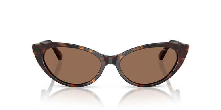 Aquest estil contemporani, una refrescant versió de la clàssica forma dull de gat amb rics adorns i detalls de disseny personalitzats, irradia confiança femenina. Perles blanques i tatxes de diamants metàl·lics adornen els laterals del front d'acetat facetat, complementat amb combinacions de colors negre, habana, granat i denim fosc. Un logotip jimmy choo estampat en plata o or pàl·lid adorna les patilles d'acetat, mentre que la frontissa personalitzada incorpora un emblema jc gravat amb làser.