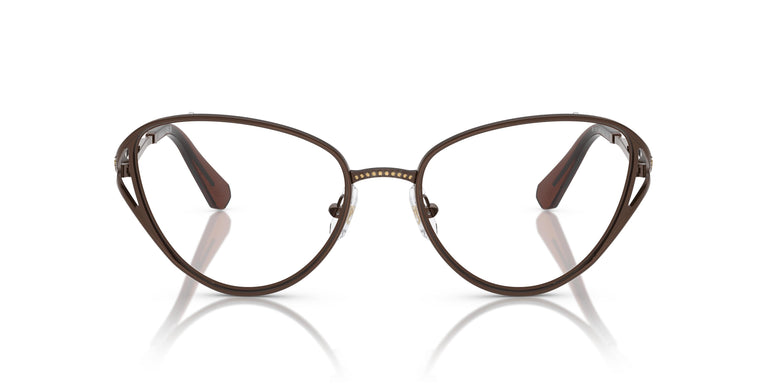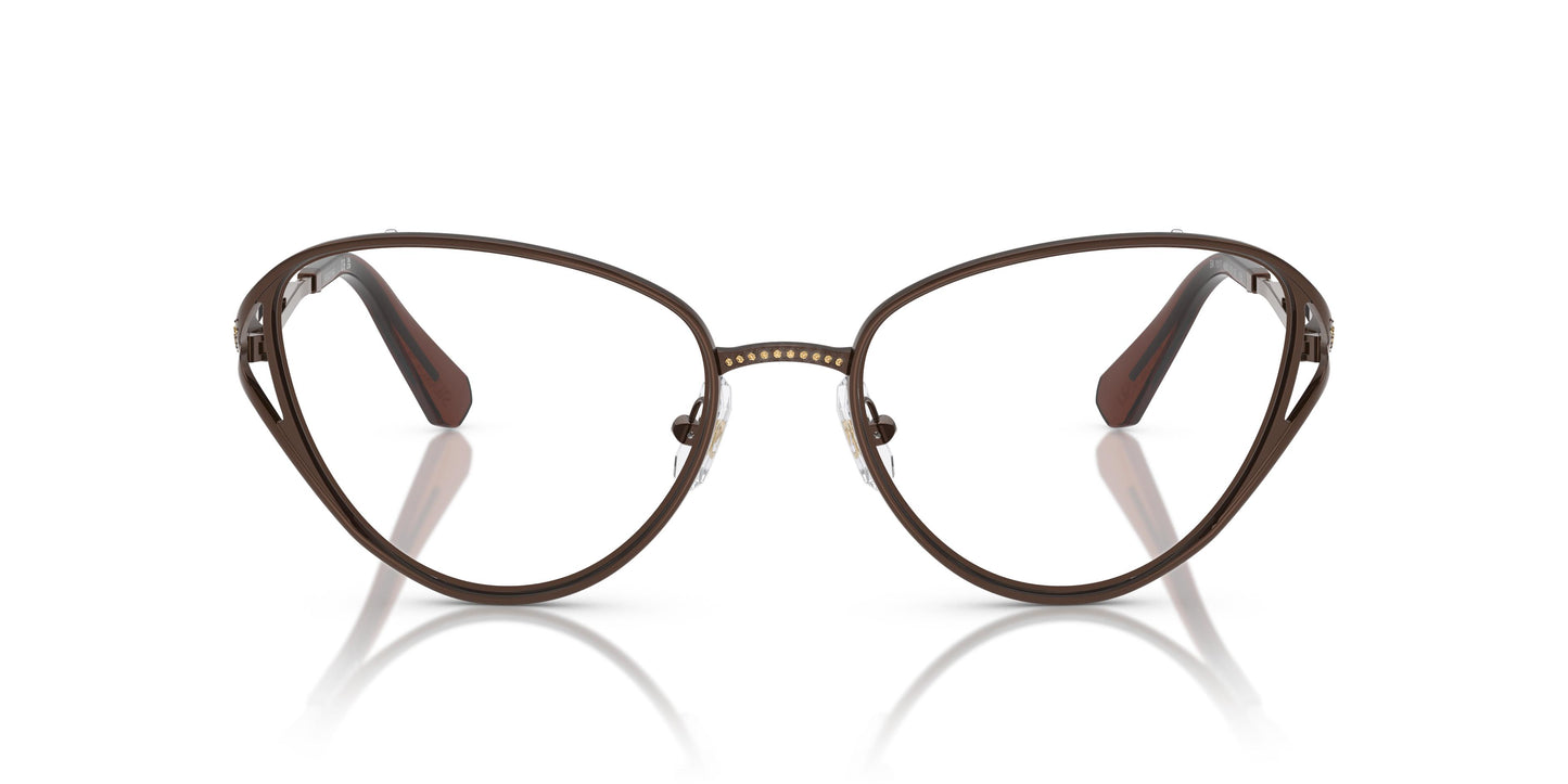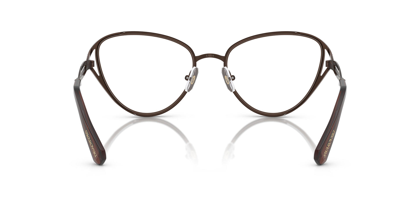 En un desplegament de brillantor i estructura, aquest model d'òptica reflecteix la llum en els vidres del pont i la part superior de les varetes, que simbolitzen l'infinit. La muntura d'ull de gat exsuda elegància, complementada amb terminals transparents en les varetes que aporten un toc de sofisticació i alegria. Amb una elaborada estructura metàl·lica, el pont i la part superposada de les varetes s'han decorat amb delicats vidres swarovski. Swarovski opta per tons pels vidres i els terminals que combinen amb el metall de la muntura, com el marró i els vidres golden shadow.