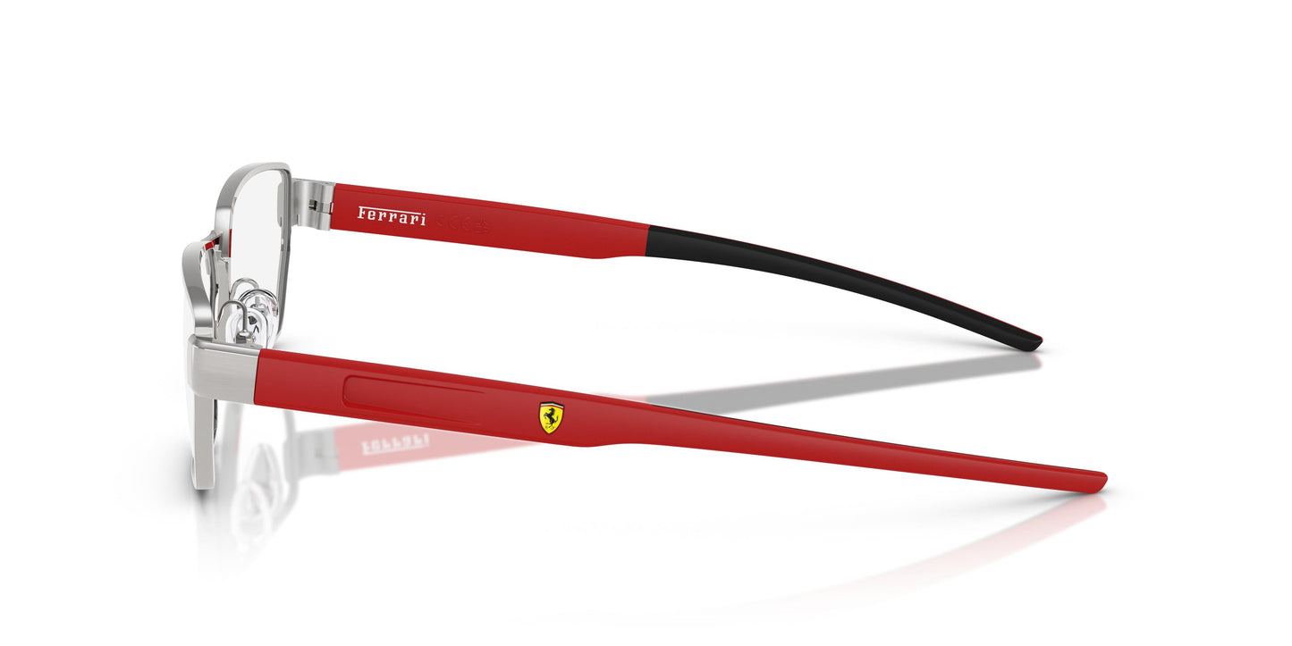 Elegante y moderno, este estilo de construcción mixta encarna el diseño de los coches de carreras. Los bordes metálicos y las patillas inyectadas crean un acabado de textura contrastada, con toques de rojo y amarillo que añaden una estética clásica de la Scuderia Ferrari. Un modelo óptico refinado con una innegable energía Ferrari. Un frente metálico estrecho y geométrico con un puente refinado y remaches envolventes. Patillas inyectadas en negro mate o rojo Ferrari con terminales de goma en contraste de color.