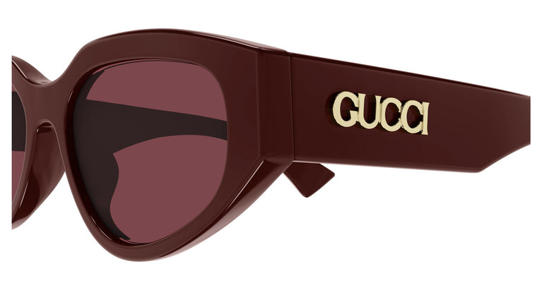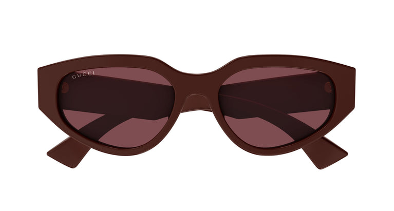Acetatmodeller med intense farver, dristige linjer og en pantotenisk vinkel. Mandelformet, cat-eye design. Tredimensionelt Gucci-logo på stængerne. Trendy farvepalet.