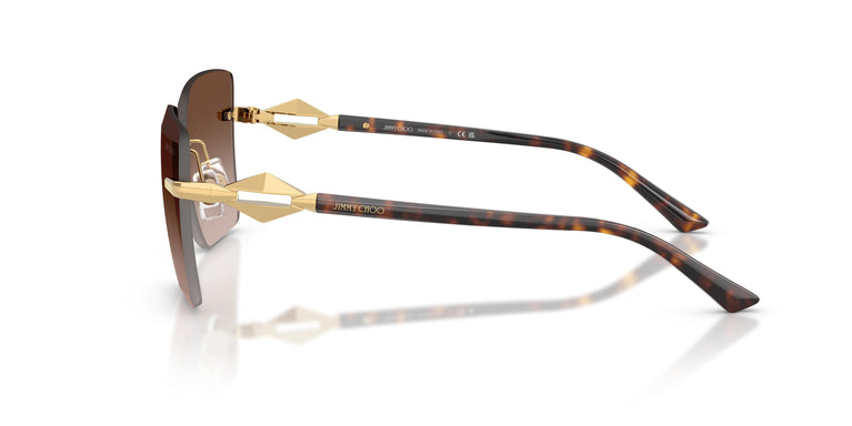 Denne raffinerede firkantede form har et kantløst design med slanke stænger, der viser Jimmy Choos ikoniske elegance. Sofistikerede stænger er forstærket af en brugerdefineret metal diamantindsats og signatur Jimmy Choo acetat spidser. De fræsede linser fås i en smuk gradient grå, brun, pink eller grøn farvepalet.
