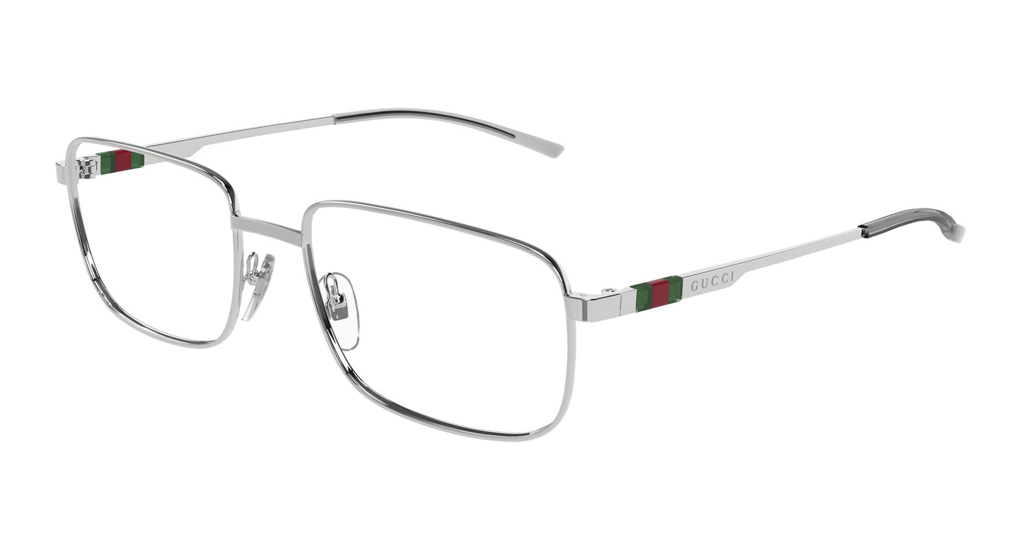 Metallische Modelle mit einer eingespritzten Webplatte, die den eleganten Metallbügel ziert. Rechteckiges Design. Die Bügel zeichnen sich durch eine farbige, eingespritzte Platte mit dem ikonischen Web-Motiv und dem lasergravierten Gucci-Logo-Schriftzug aus. Maskuline, kommerzielle und elegante Metallic-Farben.