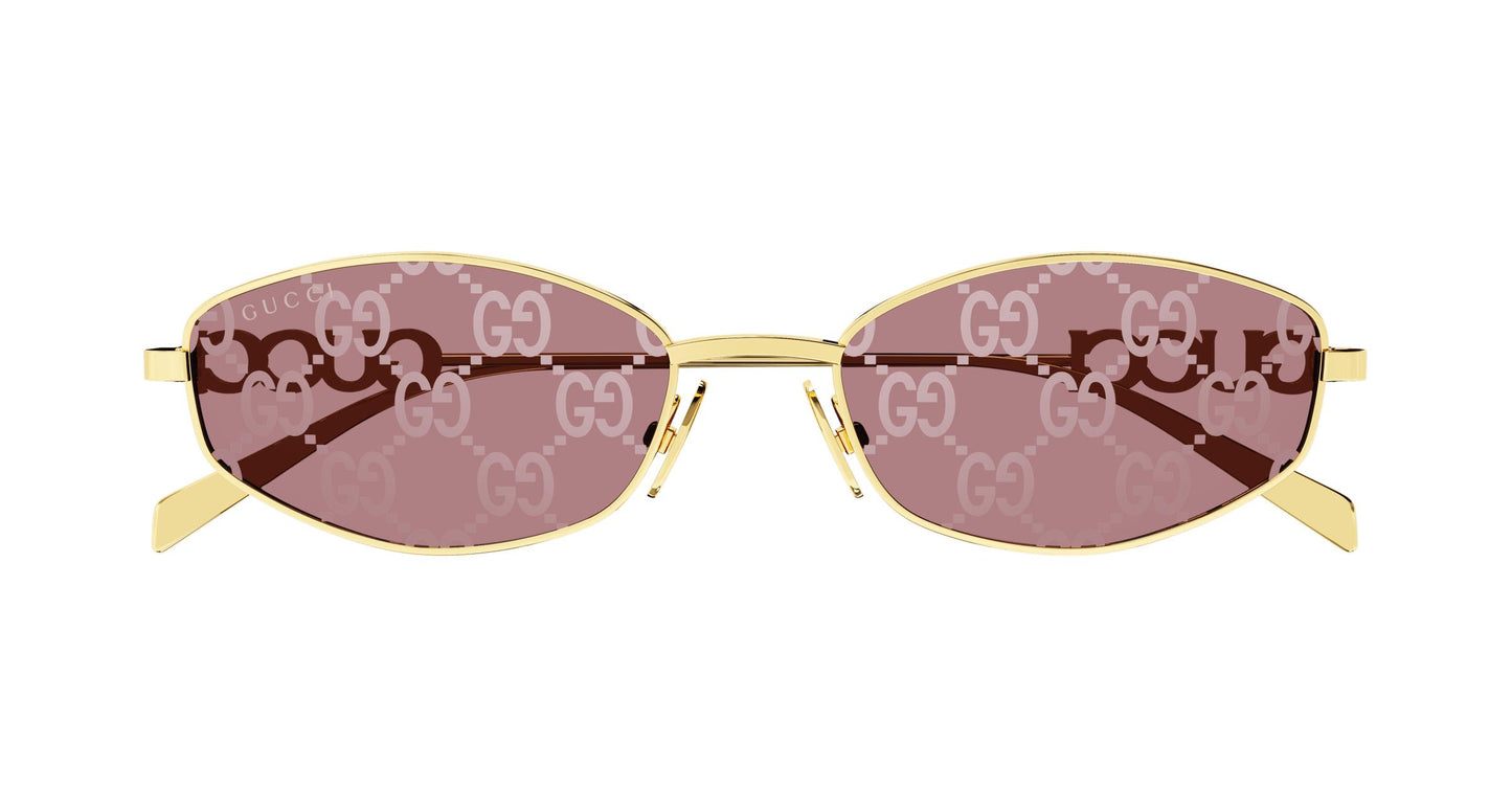 Metallische Modelle mit dreidimensionalem Gucci-Logo auf den Bügeln. Schmale, mandelförmige Form. Moderne und trendige Designs mit Guccissima- und schlichten Gläsern.
