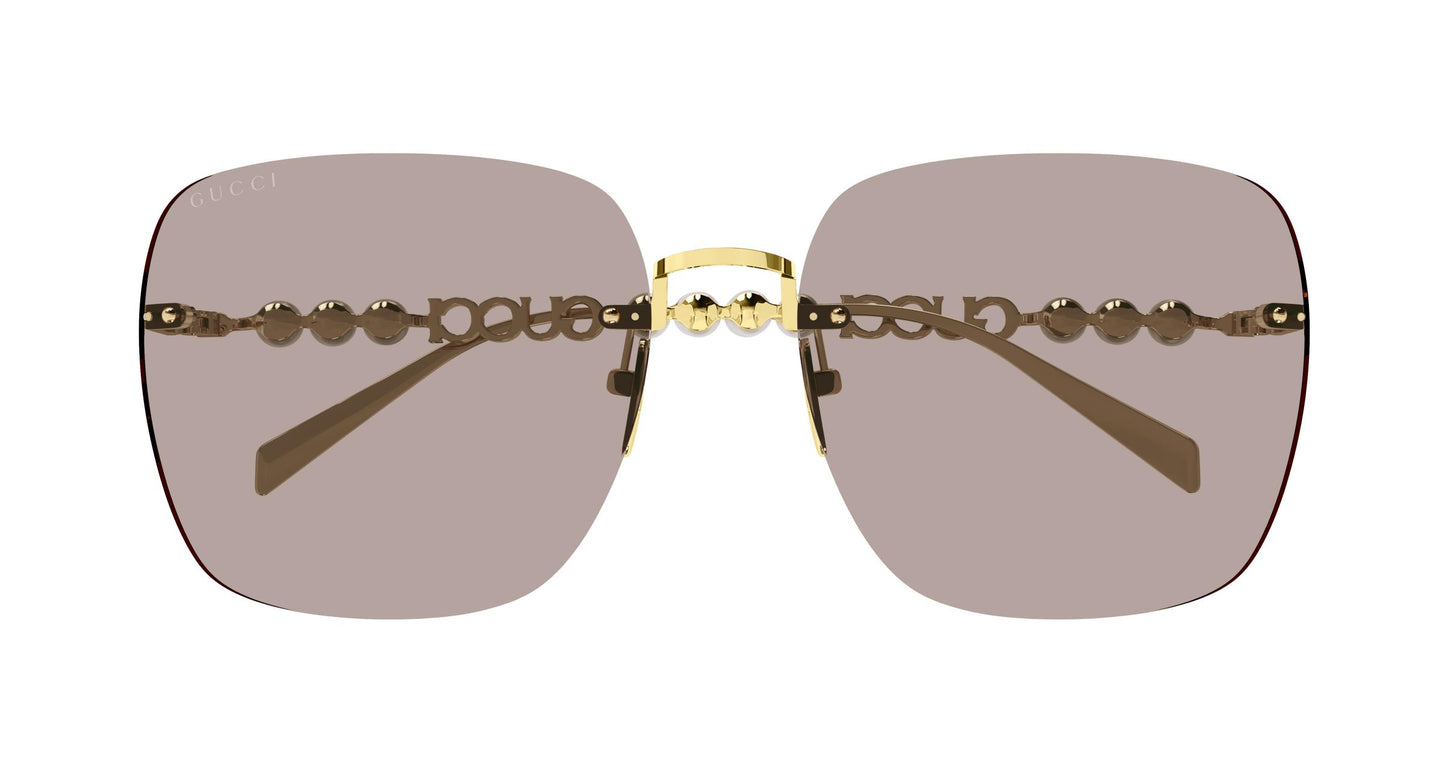 Ein wunderschönes und elegantes, feminines Design mit schlanken Metallbügeln, veredelt mit Perlen, die das ausgeschnittene Gucci-Logo einrahmen. Übergroßes, quadratisches Design mit glänzender Oberfläche. Ausgeschnittenes Gucci-Logo auf den Bügeln. Gold- und silberfarbene Metallrahmen gepaart mit dunklen und getönten Gläsern.