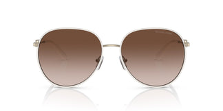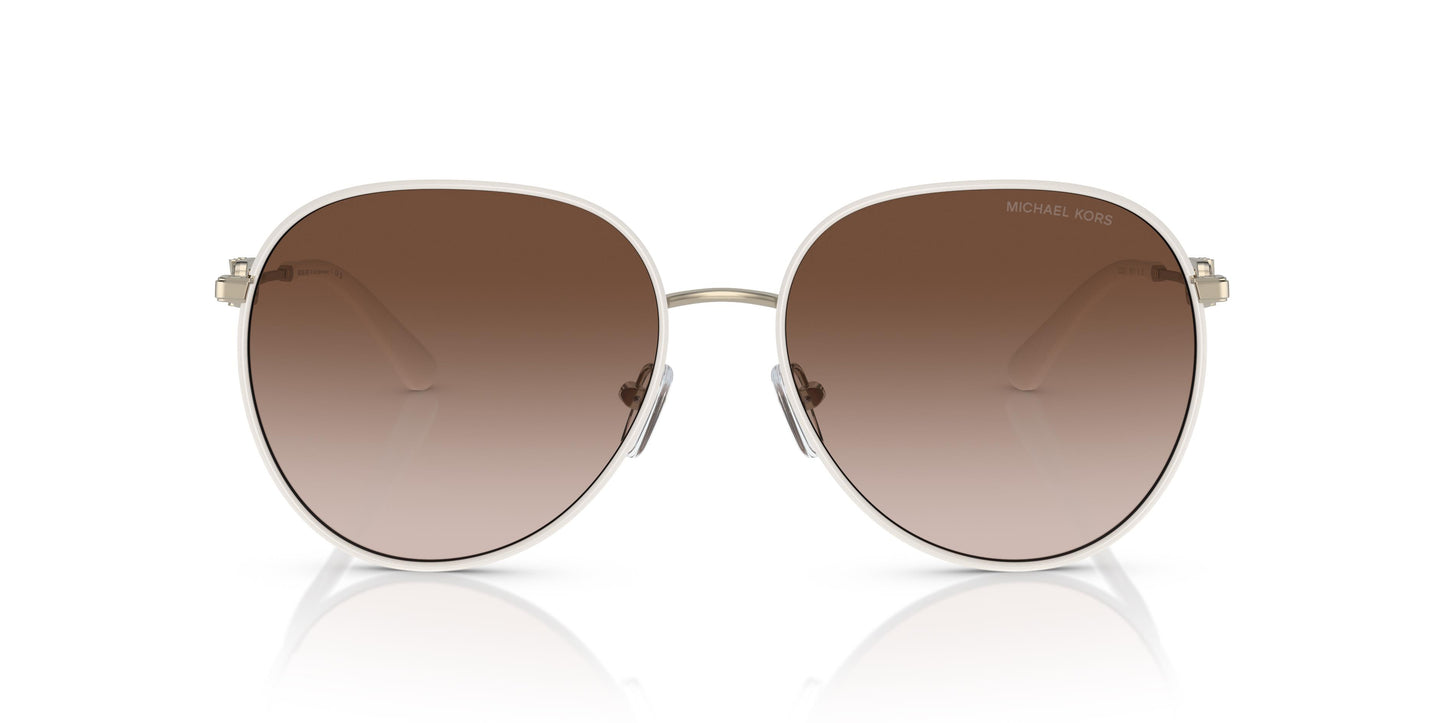 Eine Kombination aus filigranen Metallrahmen mit Windsor-Akzenten an den Bügeln. Dynamische Pilotenbrillen aus Metall mit Verlaufsgläsern. Rahmen mit Windsor-Akzenten an der Vorderseite der Bügel und Bügel mit einer filigranen Interpretation der Empire-Metallteile von Michael Kors.