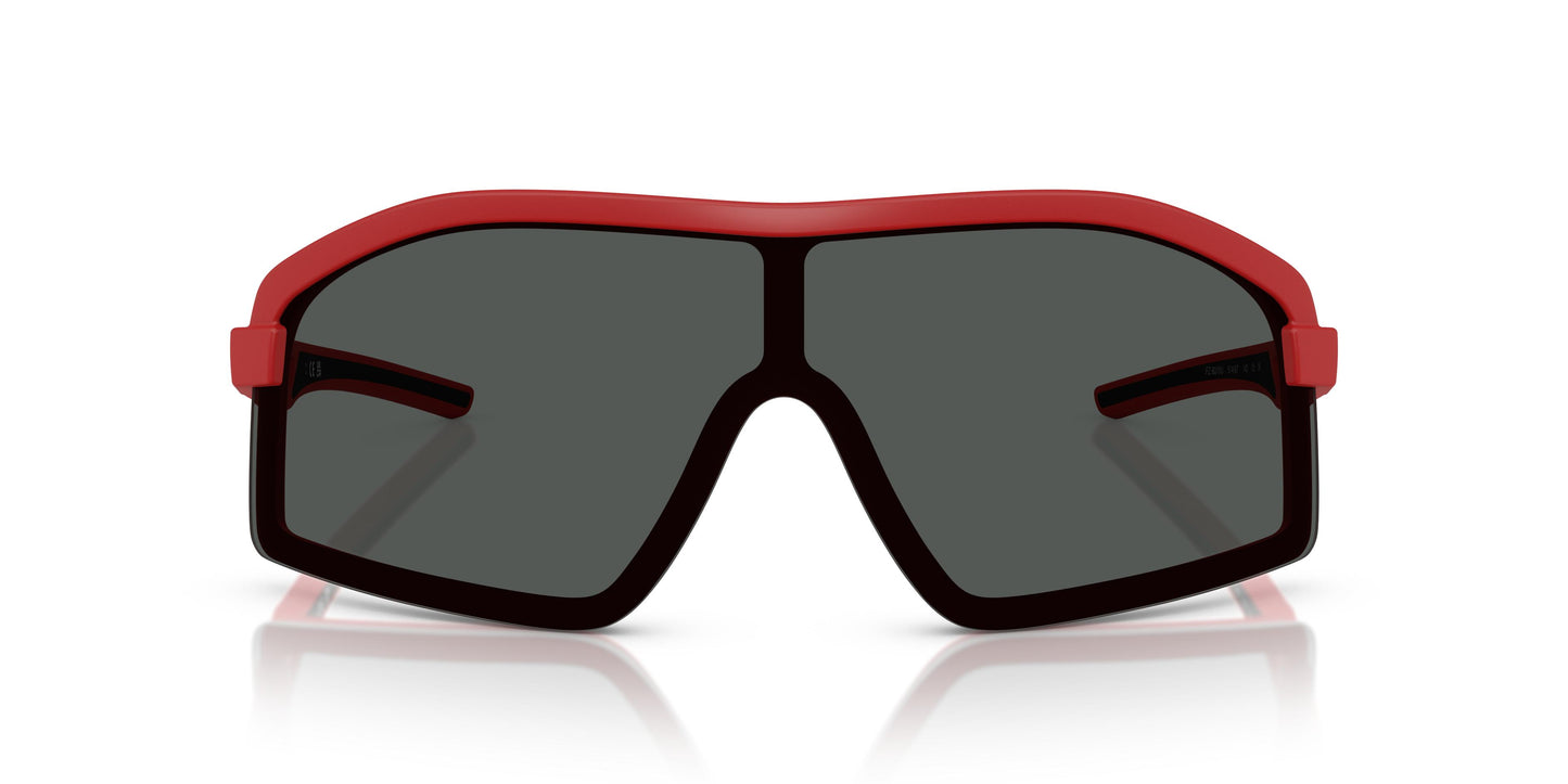 Una construcción de máscara que muestra una atrevida mezcla de formas enérgicas y materiales ligeros. La barra superior inyectada se une a las patillas del mismo color, creando un estilo deportivo con un toque de coche de carreras. El escudo de la Scuderia Ferrari completa el look, haciendo un guiño inconfundible al mundo de la F1. Monturas ligeras y futuristas en negro, blanco o rojo Ferrari, todas con acabado mate. Patillas inyectadas con terminales de goma inspirados en los coches de carreras.