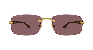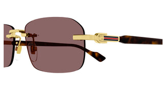 This line is inspired by a vintage piece from the Gucci archives, reinterpreted with a modern, urban attitude. The integrated logo is surrounded by a series of details, becoming part of the silhouette. The rectangular, rimless design features sophisticated temples decorated with the intertwined G logo, with gold and enamel details reminiscent of the web motif, and acetate-coated temple tips.