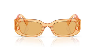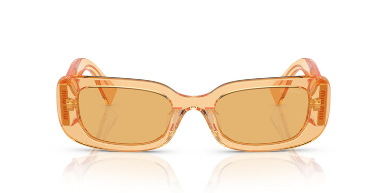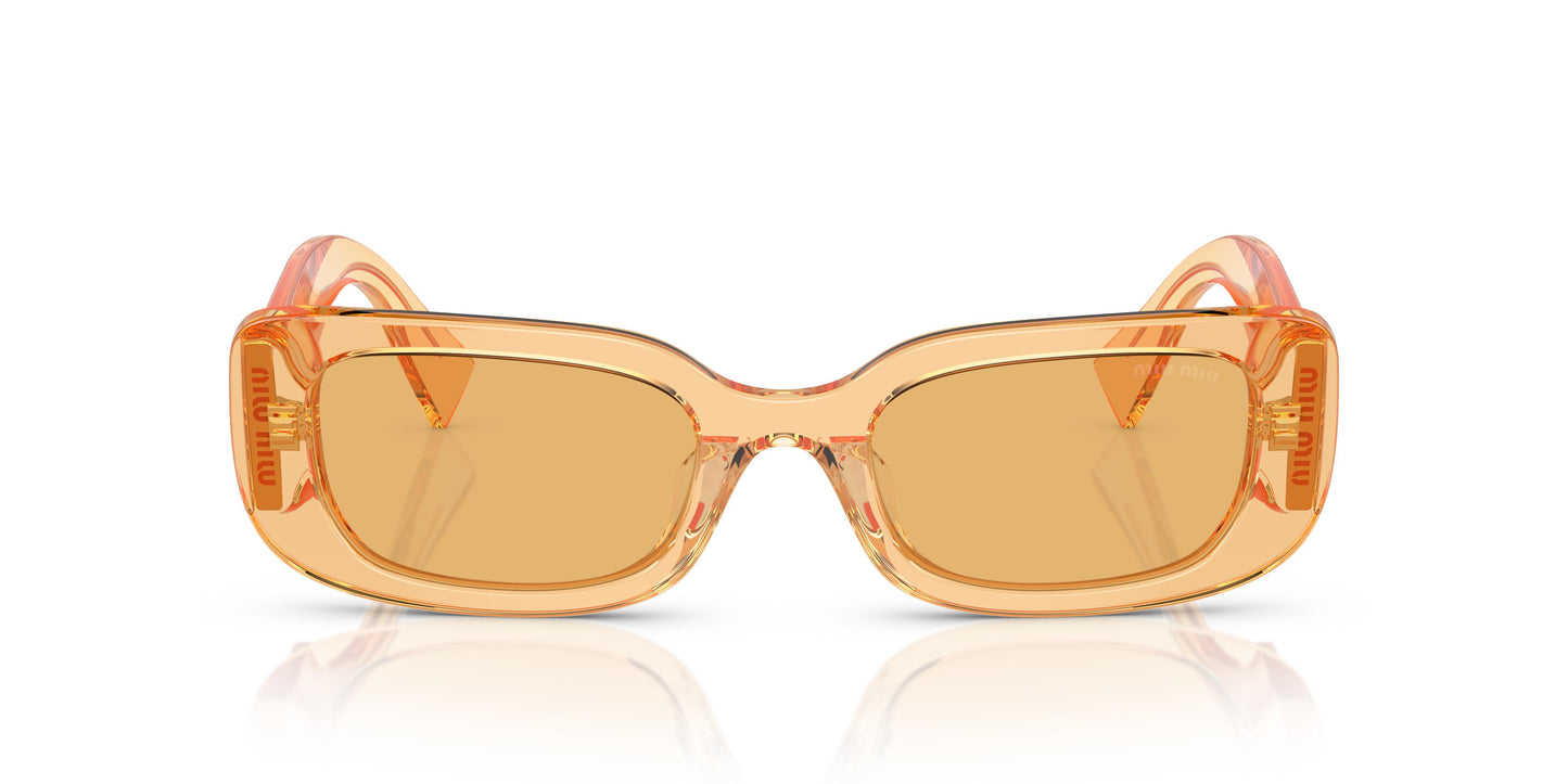 With a fashionable low-lens shape, this sunglass model is perfectly in line with Miu Miu's youthful attitude. The bold volumes and two-tone temples highlight the logo, while maintaining a sleek look and feel. A modern acetate shape with low-lenses and bold volumes, especially on the wide temples that highlight the logo. Exceptional color selection with classic Havanas, vibrant colors like transparent orange, or a monochrome black and white option.