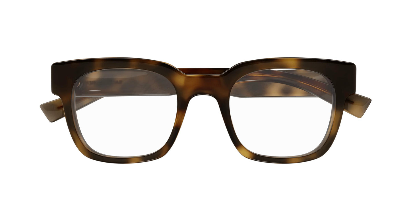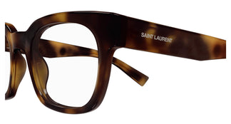The new script family is inspired by the round volumes of Monsieur Saint Laurent's vintage glasses. Classic square shape with new characteristic lines and bold volumes. Adorned with the Saint Laurent color logo on both temples.