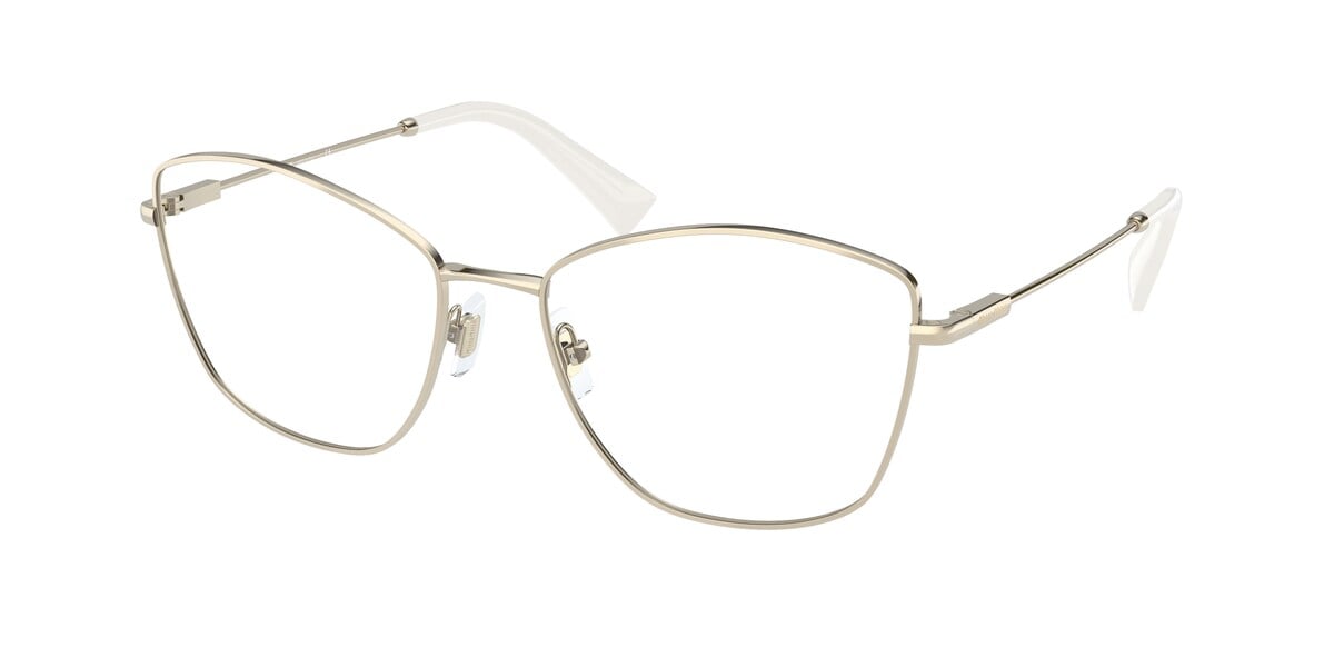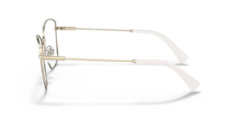 The Miu Miu Manière Evolution collection features a stand-alone eyeglasses style with clean lines and a sophisticated shape that gives the Miu Miu woman a bold yet elegant style. Three different gold color variants and two other models in red and black. The colored temple tips add a playful touch to this timeless style.