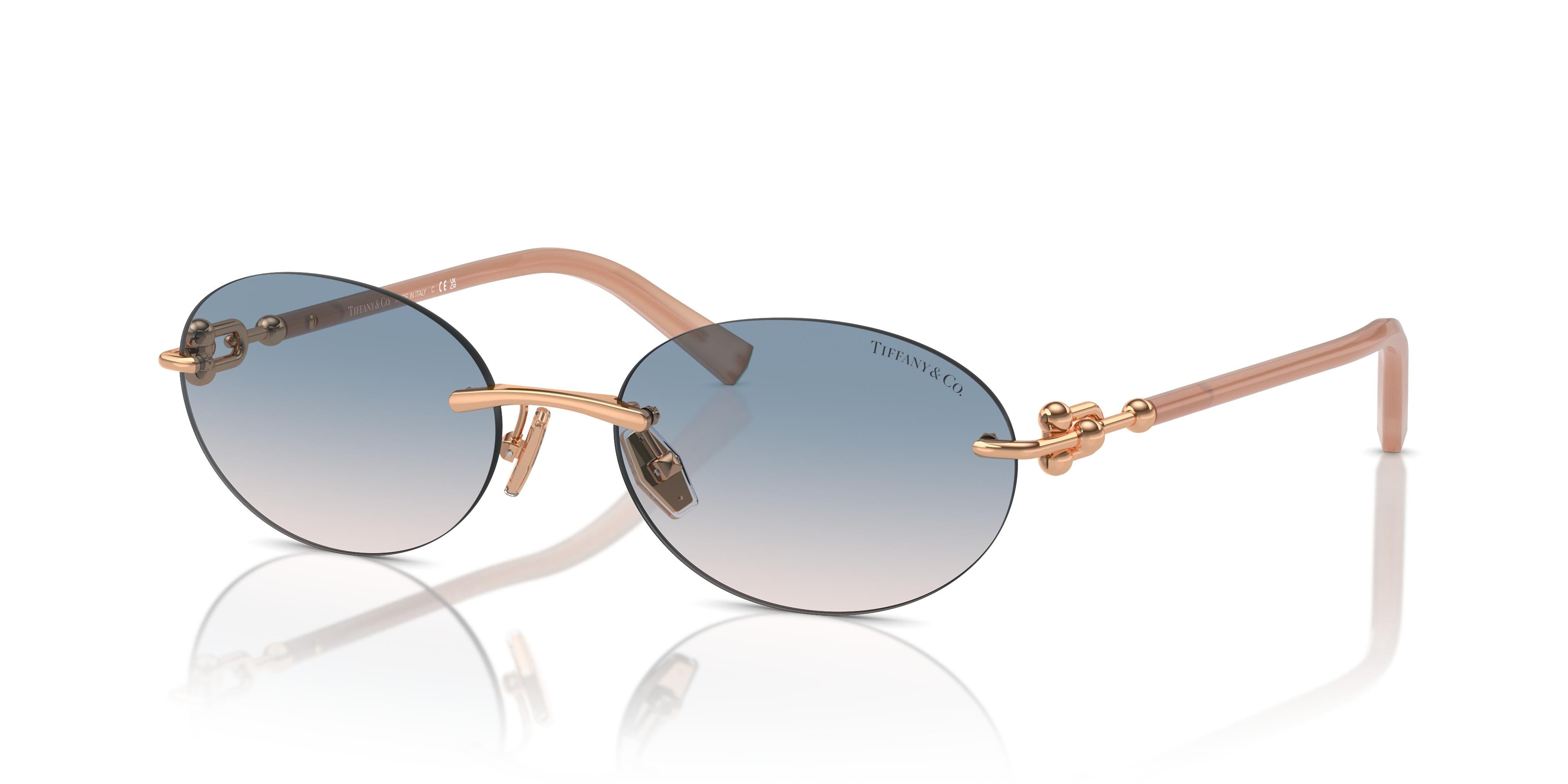Tiffany seamlessly blends eyewear and jewelry with this airy oval frame model designed for the Japanese market. The hardwear link serves as a practical hinge in metal options of pale gold or pink. Sunglasses with oval airy frame with metal link hinges and bioacetate temples. Color options include the beloved blue degradé lenses from Tiffany.