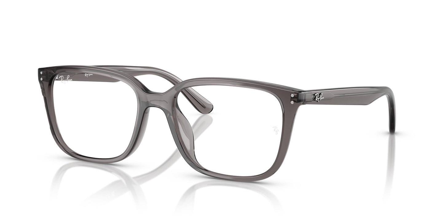 Refined and rectangular, this is a unisex optical style made from lightweight plastic. Iconic Ray-Ban design details ensure a timeless look, while the modern palette of new transparent colors adds a contemporary flavor. Simple, easy to wear, and suitable for any occasion. A rectangular front with round metal studs and the Ray-Ban signature on the lens. Frames available in classic black or transparent shades of gray, brown, pink, and blue.