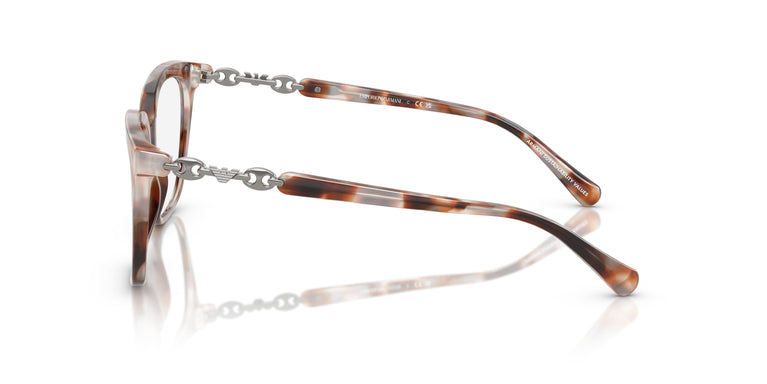 These captivating frames feature a bold cat-eye shape, accentuating the feminine front and adding a touch of vintage charm to any look. The metallic detailing on the temples, reminiscent of a delicate bracelet chain, adds a touch of refinement and luxury, elevating these glasses from a mere accessory to a true fashion statement. Soft bioacetate crafted in an elegant cat-eye silhouette for a touch of glamour. Reminiscent of the elegance of an Emporio Armani bracelet, the temples feature a metallic chain and bioacetate tips.