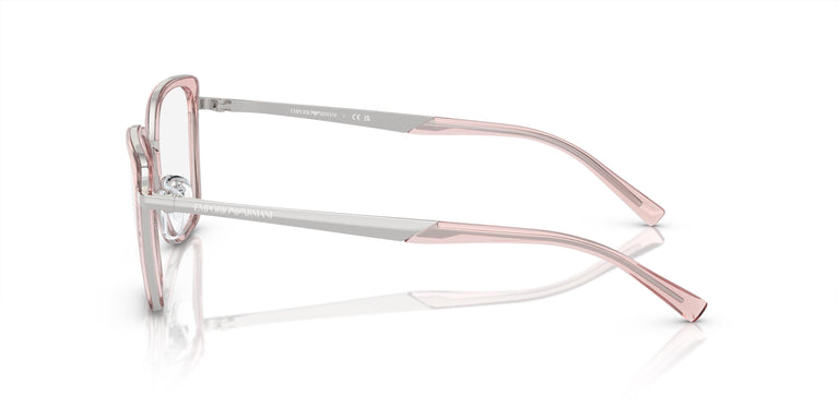 The new Emporio Armani frames reflect the brand's visionary design. A feminine oversized frame with nylon fiber rims in contemporary transparent shades. Metal and transparent nylon fiber combine to create a play on materials, a slightly oversized rectangular frame with geometric cuts.