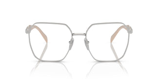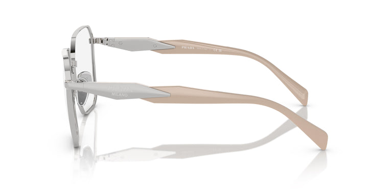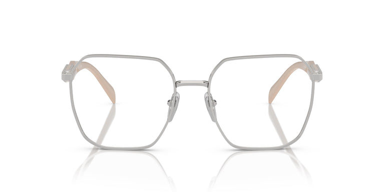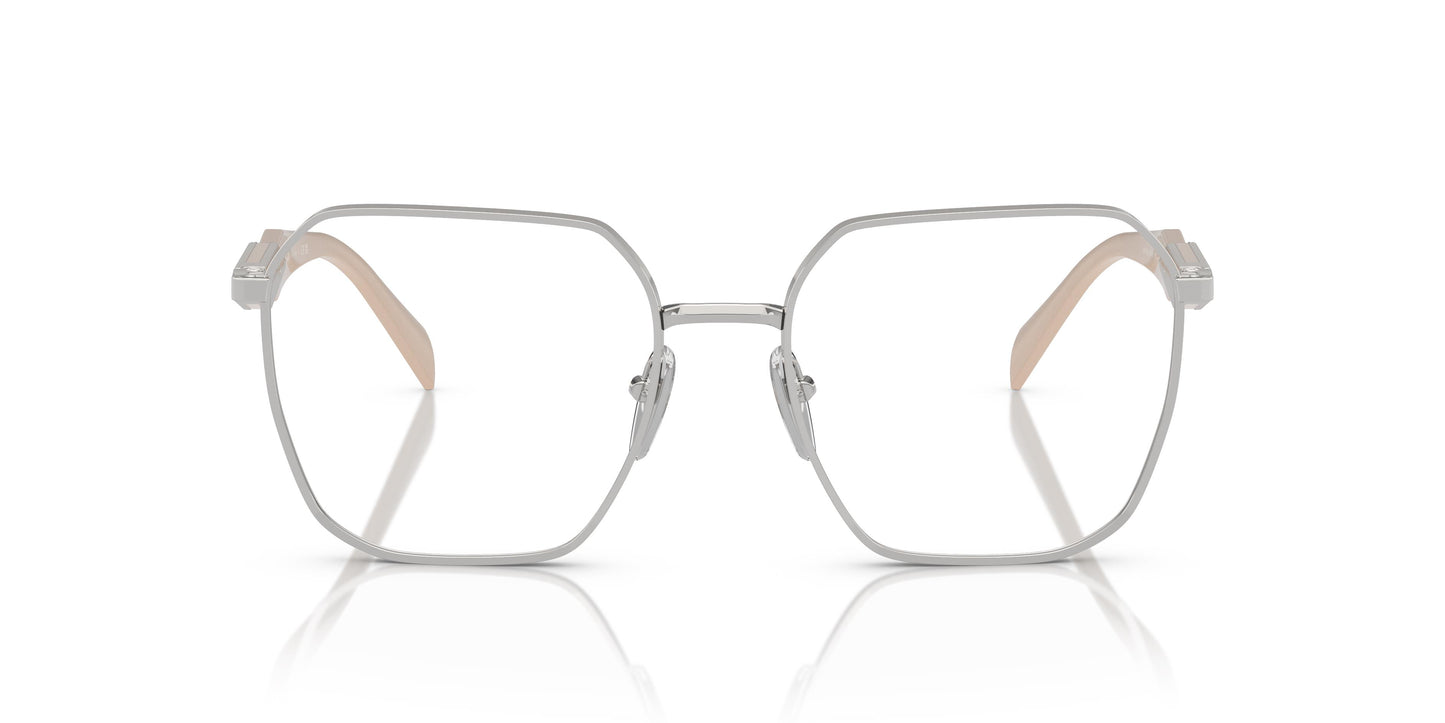Despite the oversized shape, the front frame of this model is decidedly minimalist, but the temples compensate with striking Prada touches. The temples feature a geometric logo plaque and acetate tips in seasonal colors like Green. This oversized, square-shaped, full-rim metal model is available in silver, gold, pale gold, or rose gold with matching temple plaques. Geometric temples with a laser-engraved logo on the metal part and extra-long acetate tips in classic, seasonal colors.