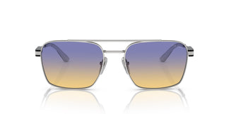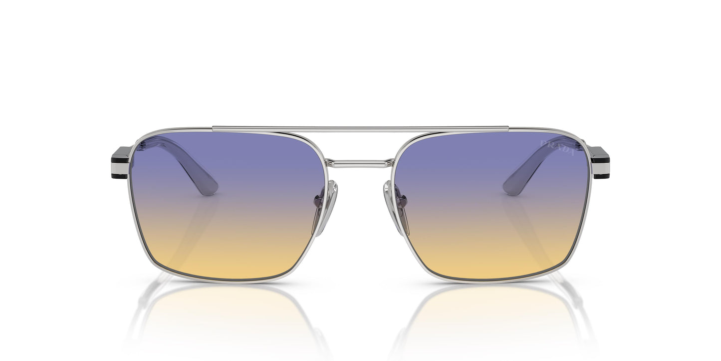 A rectangular shape executed with Prada style and precision like no other. The elegant silhouette of this double-bridge sunglass is complemented by equally refined metal plate temples. The four lens colors include a polarized option, classic colors, and a violet/yellow gradient that pops for a bold look. Metallic rectangular shape with matching metal temples and temple tips featuring the unmistakable metal plate with logo lettering.