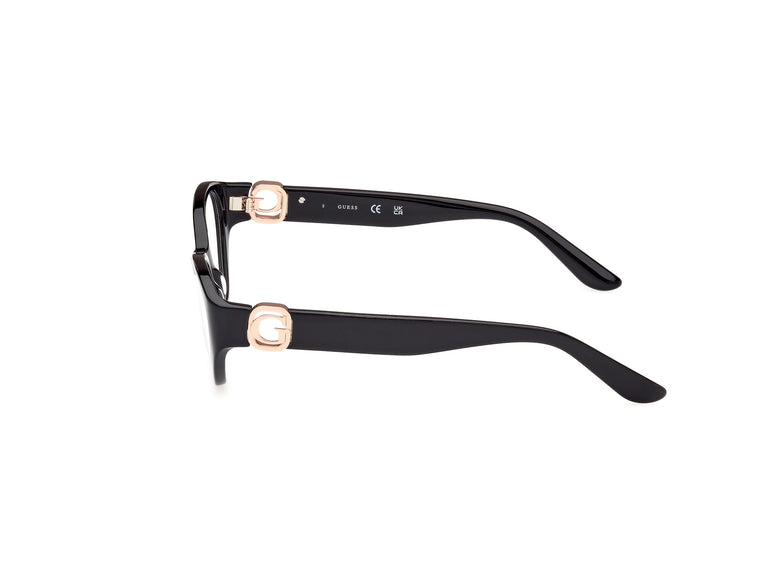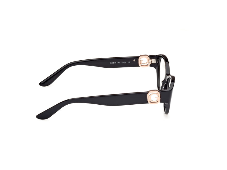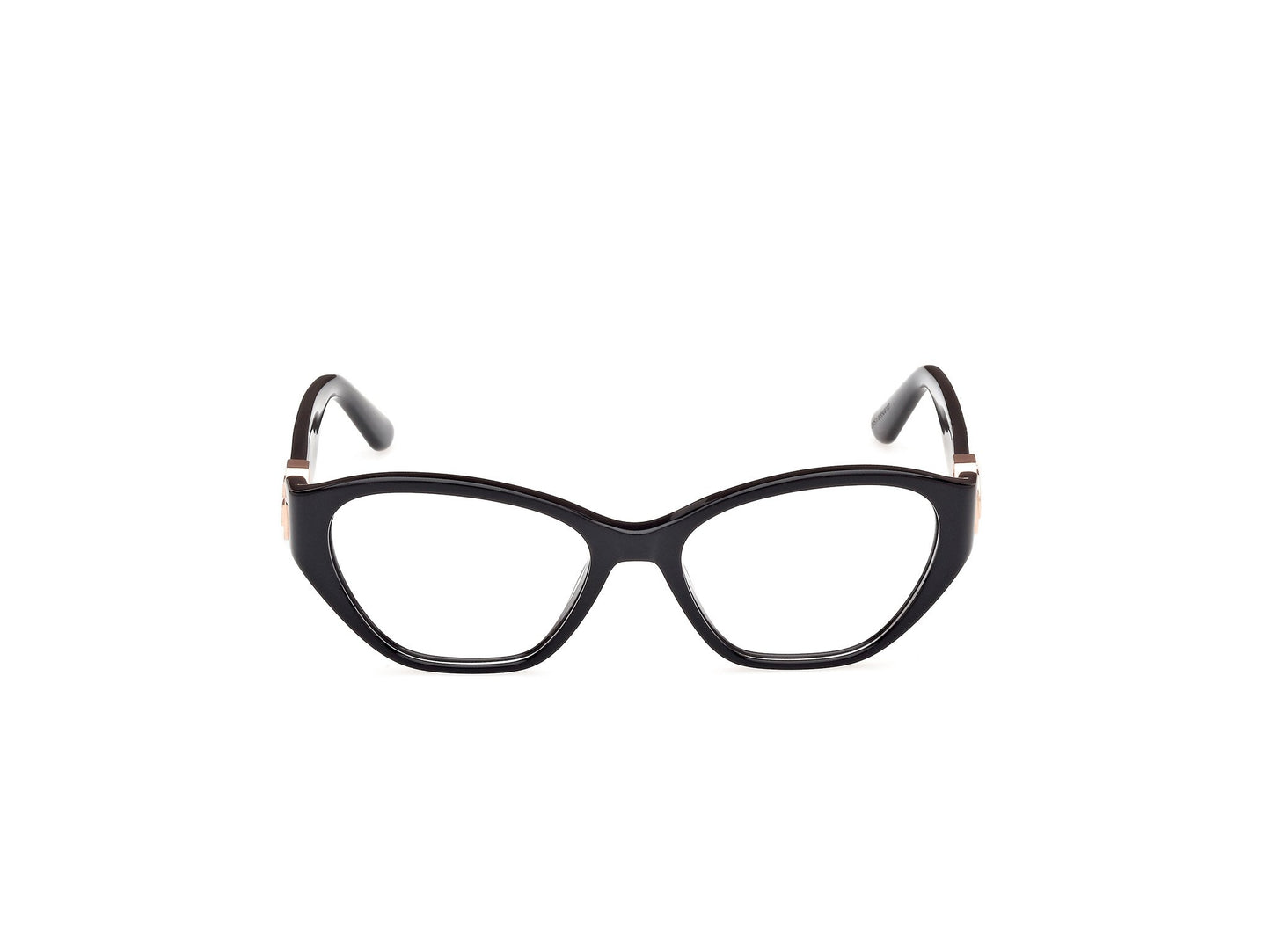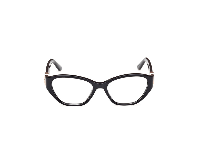 Introducing the Guess GU50119 eyeglasses, a masterpiece of optical design that embodies sophistication and modern style. The cat-shaped frame, crafted from sleek, glossy black plastic, evokes an aura of mystery and distinction. The carefully sculpted temples flow gracefully from the bridge, offering a comfortable and secure fit. This accessory not only complements your vision but also adds a touch of glamour to your appearance.