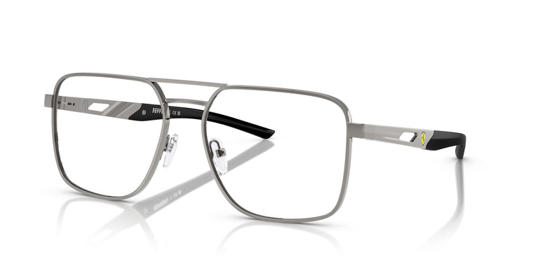 El metal unido a la bi-inyección chocan en este estilo óptico. Desde el elegante frontal metálico hasta las ligeras patillas, este modelo está impregnado de la energía de los deportes de motor. El estilo Athleisure y las puntas de las patillas en contraste de color completan el look con la reconocida alma Scuderia Ferrari. Aros metálicos de forma cuadrada con doble puente en colores monocromáticos negro, gunmetal o plata. Las patillas inyectadas con detalles de tomas de aire evocan el dinámico diseño de los coches de carreras.