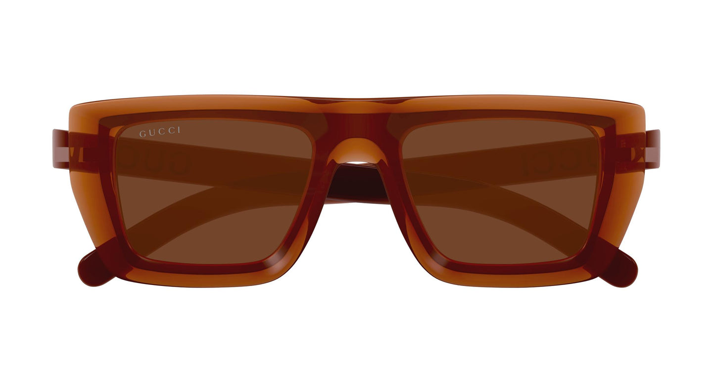 Glossy, colorful plastic with a visible spoiler. Square shape with a flat top. Embossed Gucci logo varnished on the temples. A pop color palette enhanced by contrasting colors that highlight the uniqueness of the frames.