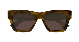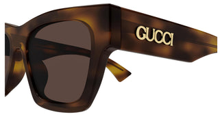 Acetate models with bold, intense colors and a pantothenic angle. Square cat-eye design. Three-dimensional Gucci logo on the temples. Trendy color palette.