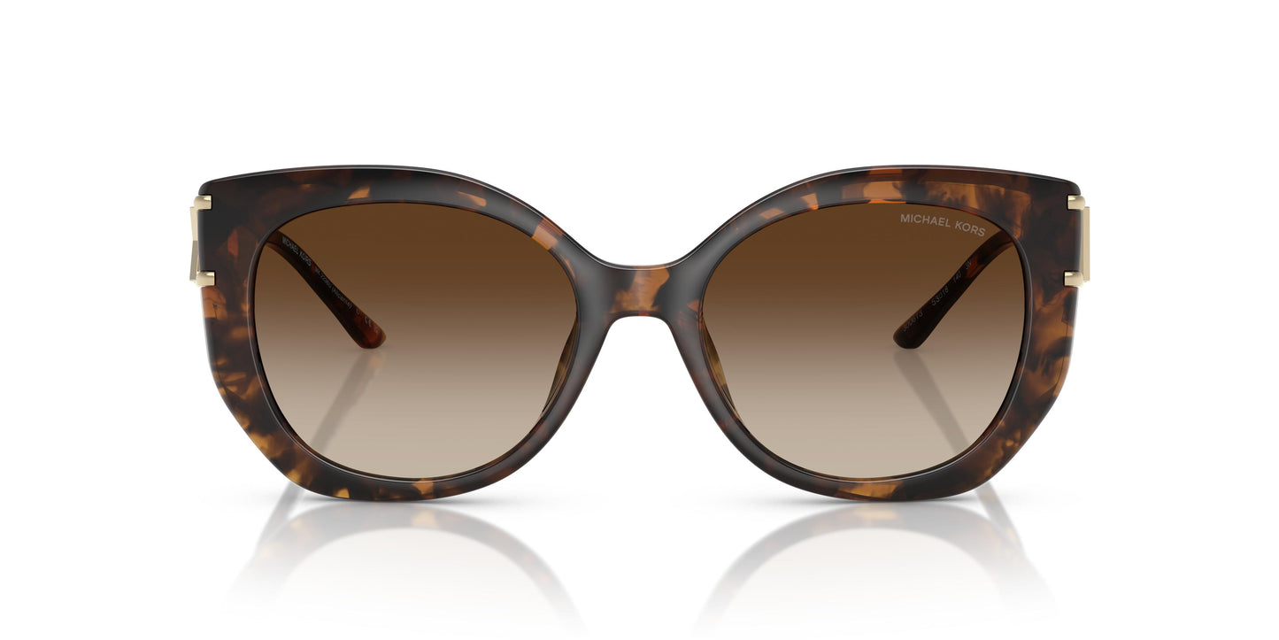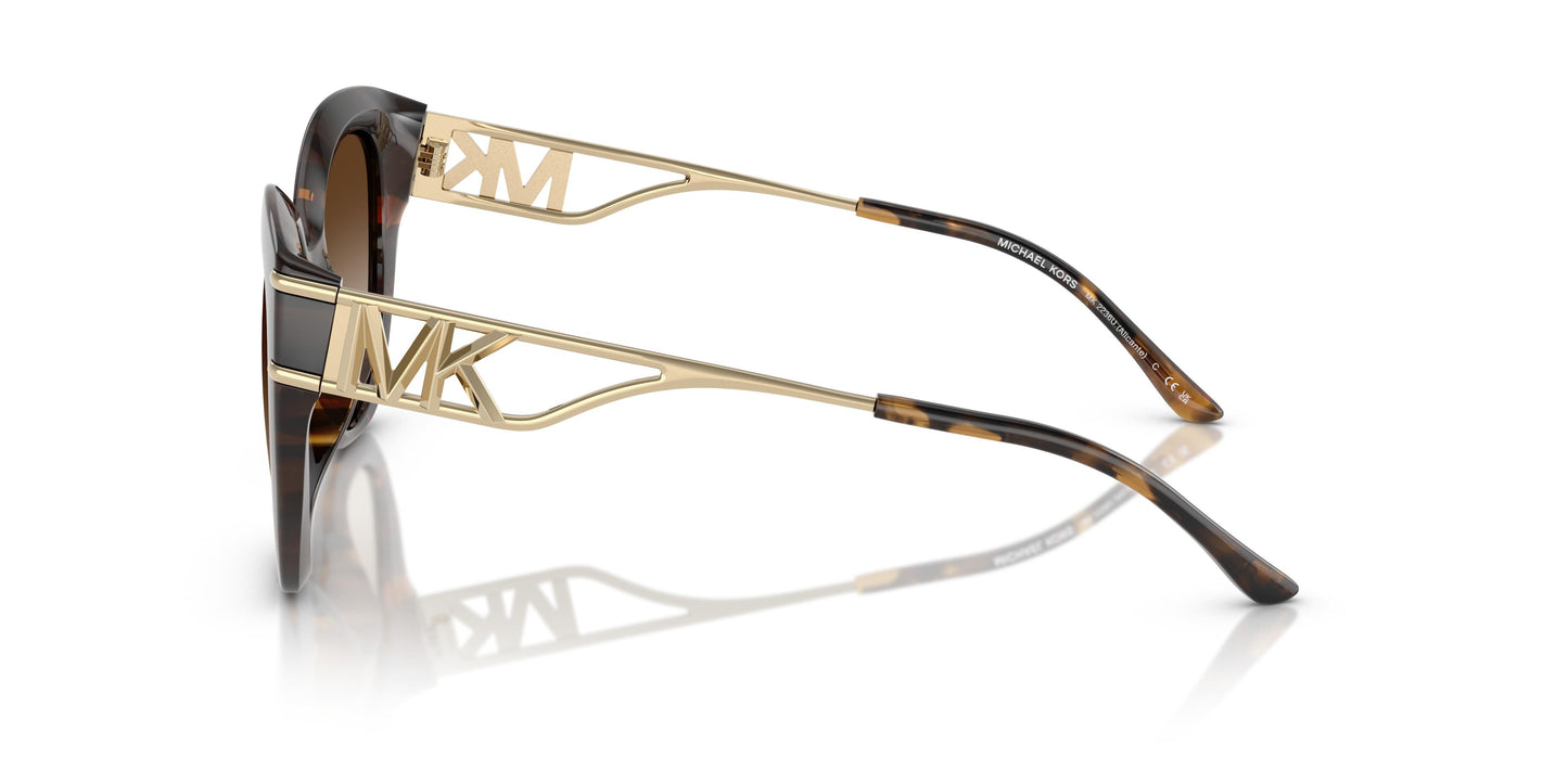 Featuring a subtly faceted MK logo on an open metal temple, this silhouette embodies the essence of modern glamour. The edgy shape flatters with its timeless appeal, for the woman who appreciates both luxury and versatility in her accessories. The open metal temple is enhanced by a faceted MK logo. Choose from sophisticated black, timeless dark tortoise, or warm camel, available with plain or gradient lenses.