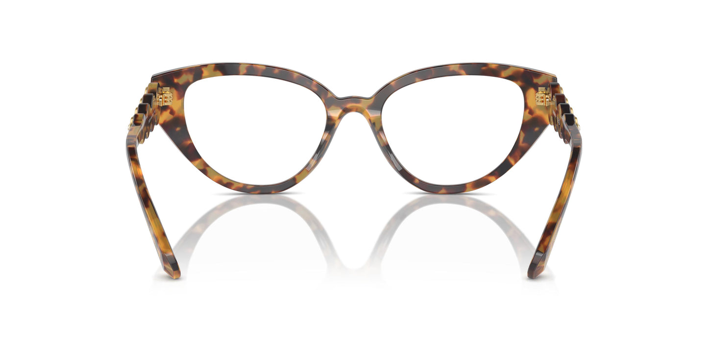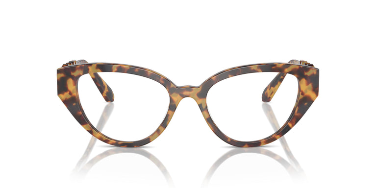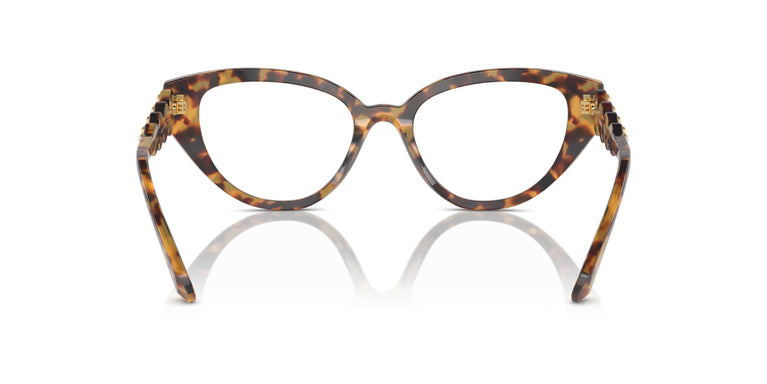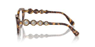 A cat-eye frame with acetate illuminated with 4 shiny Swarovski crystals along the temples. Temple inspired by the brand's jewelry collections, where crystals are set in metal bezels. The 4 shiny crystals on each temple are from Swarovski and the end tips offer an extra touch of the brand with a subtle logo. Transparent crystals with golden coating in the colors of black, havana, and burgundy acetate. Aquamarine tone on tone in the blue-white option.