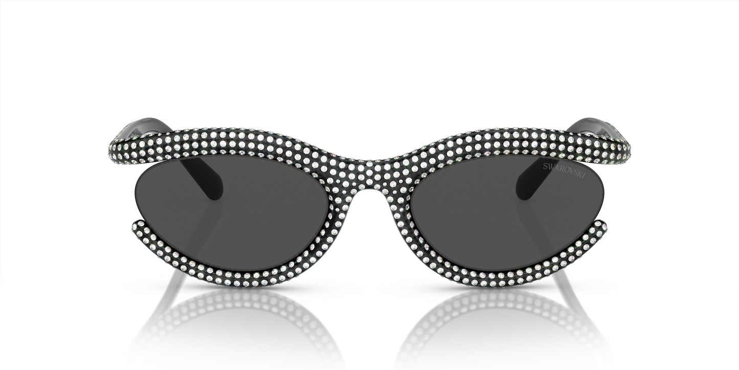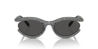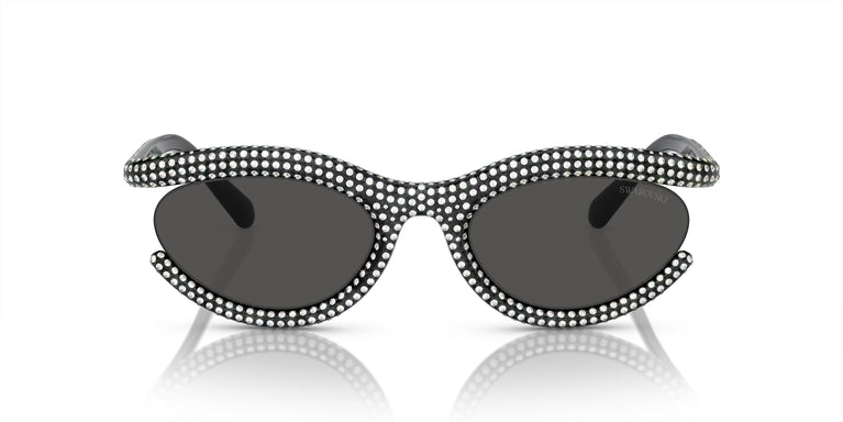 Swarovski presents a striking design that will enhance any outfit with glamorous style. Its bold and chic shape is adorned with meticulously set crystals and features rounded profiles on the frame and temples. Semi-open oval frame with bold and rounded volumes, adorned with over 600 hand-applied pavé crystals. Frame available in four vibrant colors: black, gold, milky white with transparent crystals, and green with matching green crystals.