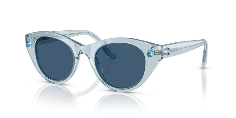 These fun Swarovski sunglasses exude a retro chic vibe. Inspired by the Swarovski millenia family, the round frames are made of acetate. The mini crystals, which bring the brand's exclusive sparkle, are arranged on the front and on each temple, and are presented in Swarovski's identifiable octagonal shape. Set in a bezel, there are 2 crystals on the front and 2 on the temples, with an exclusive octagonal cut. In a display of cheerful extravagance, Swarovski offers combinations of transparent colors in light blue, pink, and green with matching crystals.