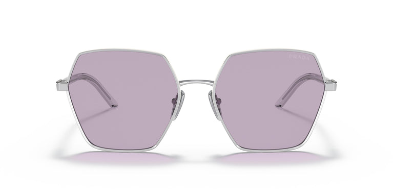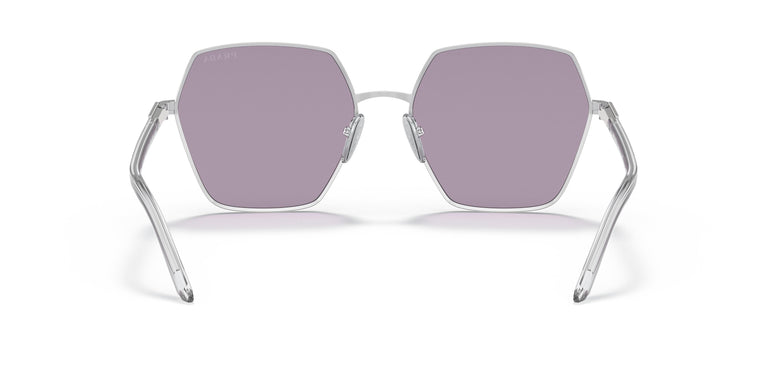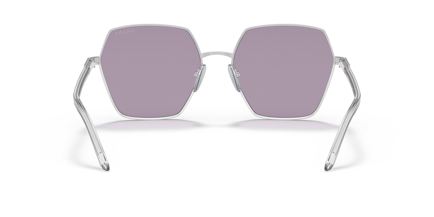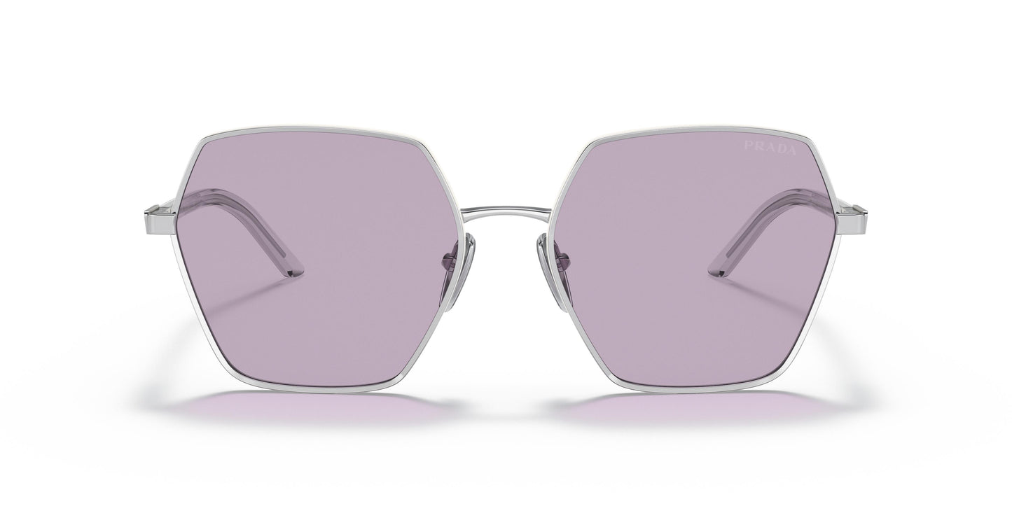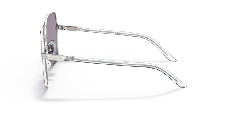 Decoración inspirada en Prada, que reinventa los iconos de la marca como elementos estructurales de estilo, define el perfil de una ecléctica selección de monturas híbridas con perfiles de metal finos o de glamuroso acetato con detalles de color esmaltados o en acetato. Femenina montura de ojo de gato de metal con una sinuosa barra superior de metal para un look elegante y sofisticado Logotipo del triángulo recortado en la mitad de la varilla de metal antes del terminal de la varilla