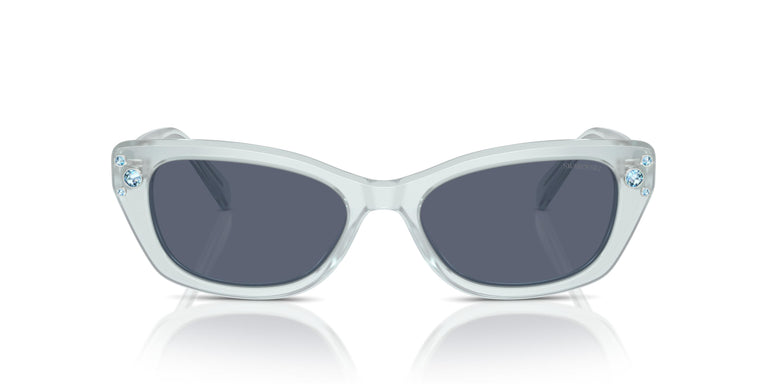 Swarovski plays with patterns in this design of sunglasses with rectangular frame, and the fun doesn't stop there. The brand also experiments with colors to offer bold and modest options. Polarized lenses available in dark blue color on light blue whitish acetate that matches with aquamarine crystals. Swarovski crystals infuse a magnificent shine to this acetate design, adorn the corners of the frame, and start on the temples.
