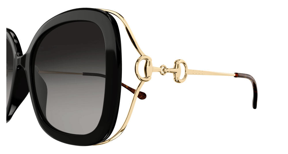 Iconic Gucci symbols merge to create a unique structure with a bold forked temple and a new Horsebit hinge. A collection featuring vintage-inspired designs enhanced with lustrous materials. Combined with an oversized square design with rounded edges, the Horsebit symbol is discreetly engraved with the Gucci logo on the temples. Available with gradient lenses with soft, warm lines that perfectly complement the precious gold finish.
