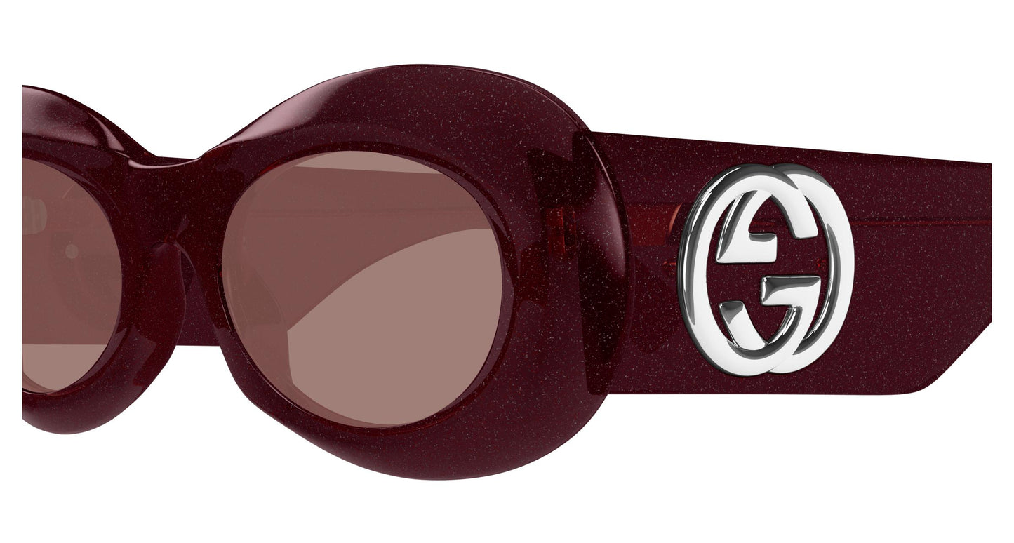 Inspired by Monica Vitti's style, with bold, faceted shapes enhanced by the intertwined G logo on the temples. Oval design. Intertwined logo. Trendy color palette embellished with sparkling details.