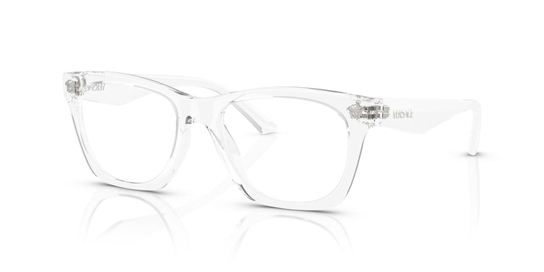 Square and sophisticated, this masculine design is reminiscent of a best-selling sun style with signature jellyfish decoration and refined, sculpted temples. For a contemporary twist on a classic look, don't miss the new transparent grey colour with contrasting silver trims. Metallic jellyfish plaques and the versace logo add a luxurious finish to the lightweight frames. A monochrome colour palette of black, havana, crystal and transparent grey elevates the style.