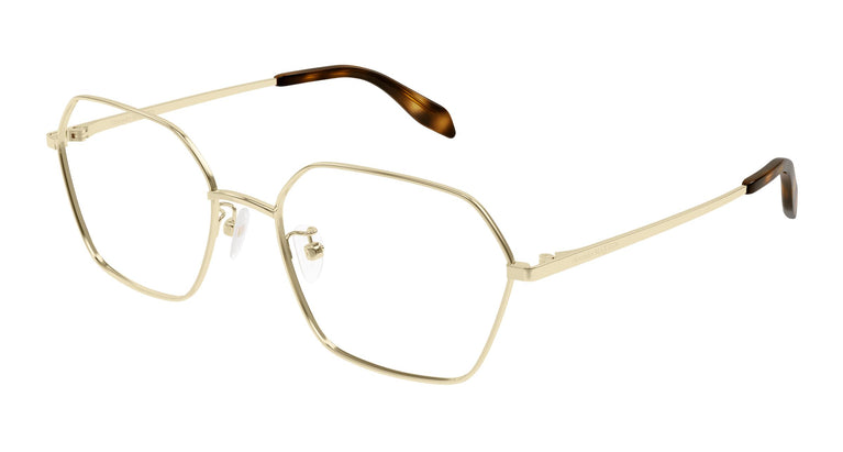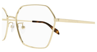 The Essential family evokes Alexander McQueen's pure soul and his strong connection to metal accessories. The geometric hexagonal design is crafted from metal with plastic tips. The Alexander McQueen logo is laser-engraved on the temples. The color palette includes classic shimmering metallics such as gold, silver, and rose gold.