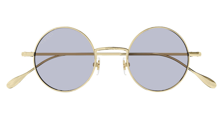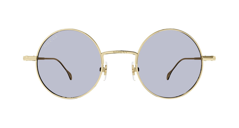 Round design with a sleek metallic construction. Laser-engraved Gucci logo on the temples. A shimmering metallic color palette combined with colorful, commercially-inspired plain lenses.
