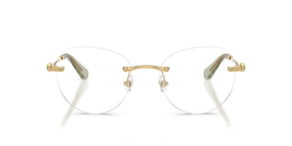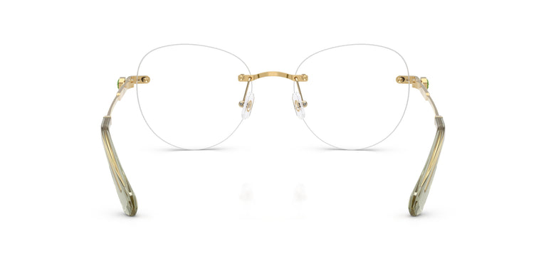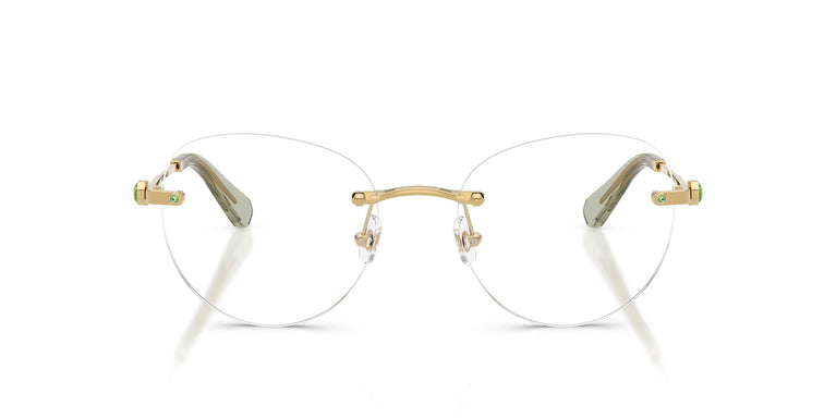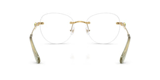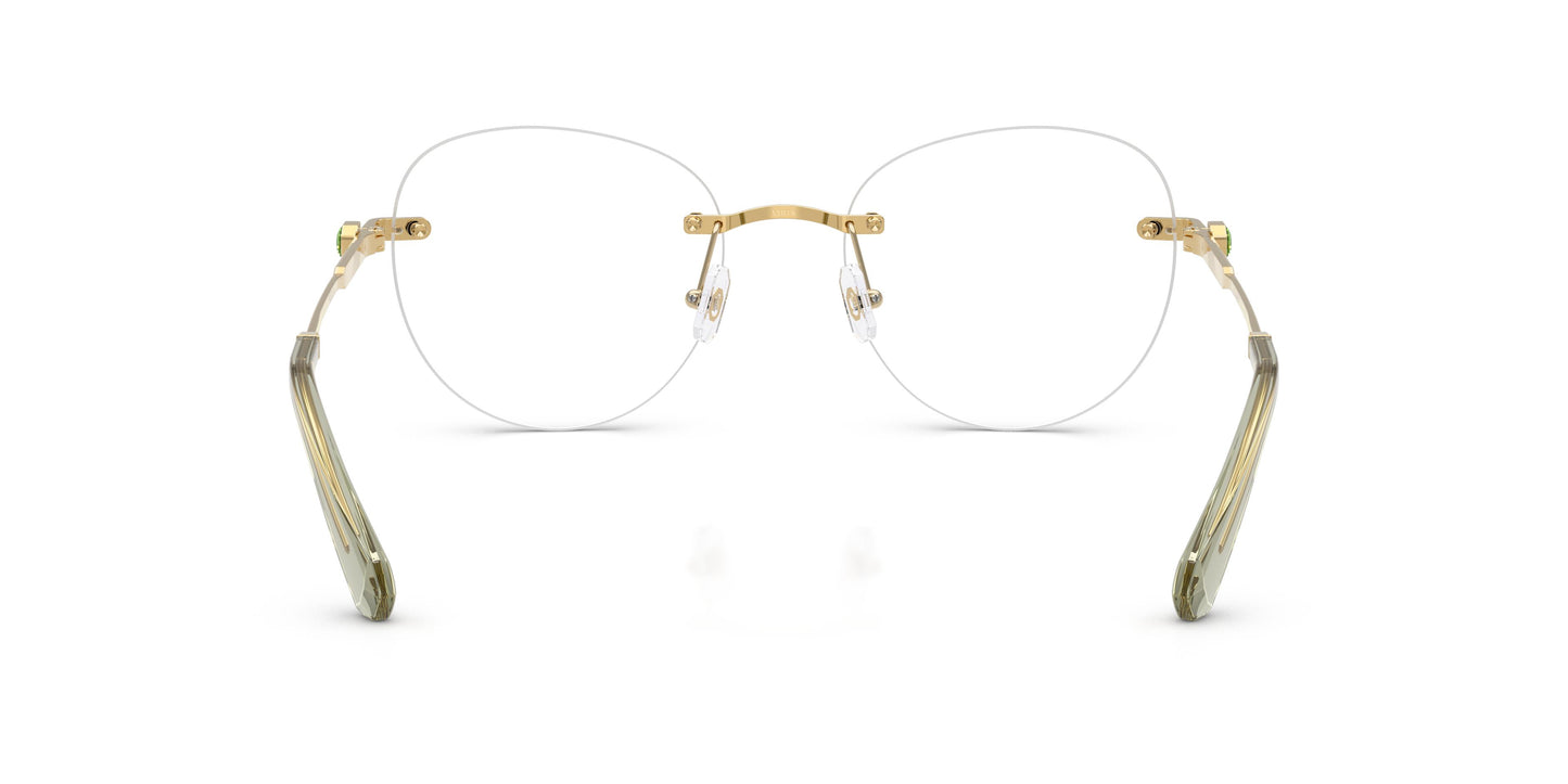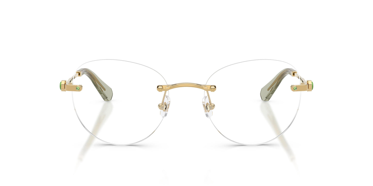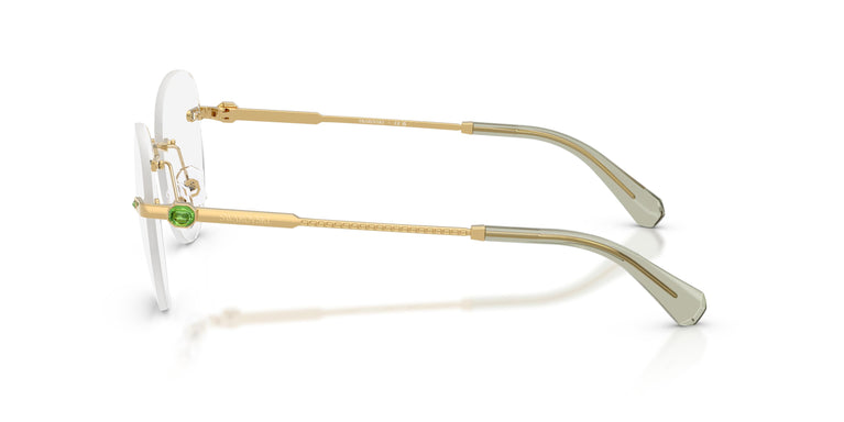 Con lentes sin montura y una elegante construcción metálica, son los exclusivos cristales octogonales en transparente, rosa claro, sombra dorada o peridoto los que acaparan la atención en estas gafas ópticas. Los delicados cristales se engarzan con gracia en las patillas, añadiendo un toque de refinado brillo al diseño minimalista. Lentes redondas sin montura con puente y patillas plateados, dorados o dorados pálidos, acabados con terminales de acetato en tonos habana o transparentes. Un reluciente y exclusivo cristal octogonal destaca en las patillas, que también incorporan el logotipo de Swarovski y pequeños grabados octogonales.