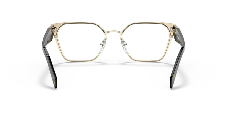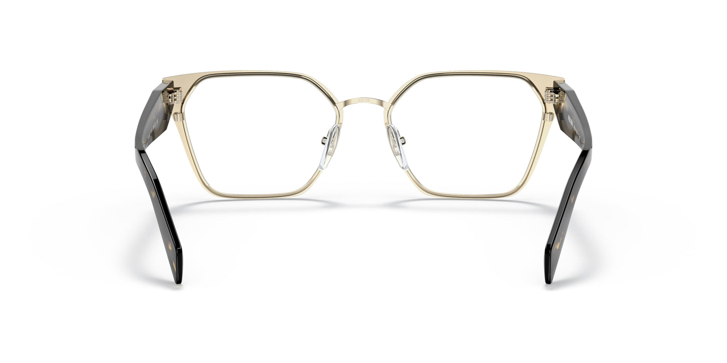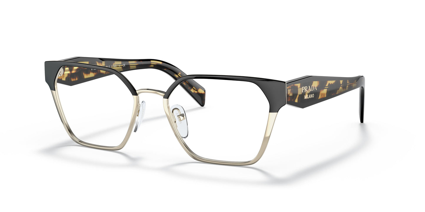 Discover the timeless elegance of the Prada 0PR 63WV eyeglasses, designed for the modern woman who appreciates sophistication. This irregularly shaped frame seamlessly combines refined black metal with hints of pale gold, creating a sublime contrast. The precisely sculpted temples offer a comfortable and secure fit, while the delicately arched bridge ensures impeccable balance. An essential accessory for those who value style and distinction in every look.