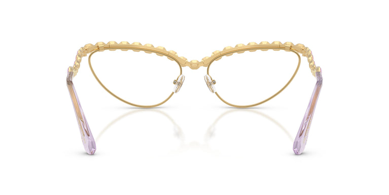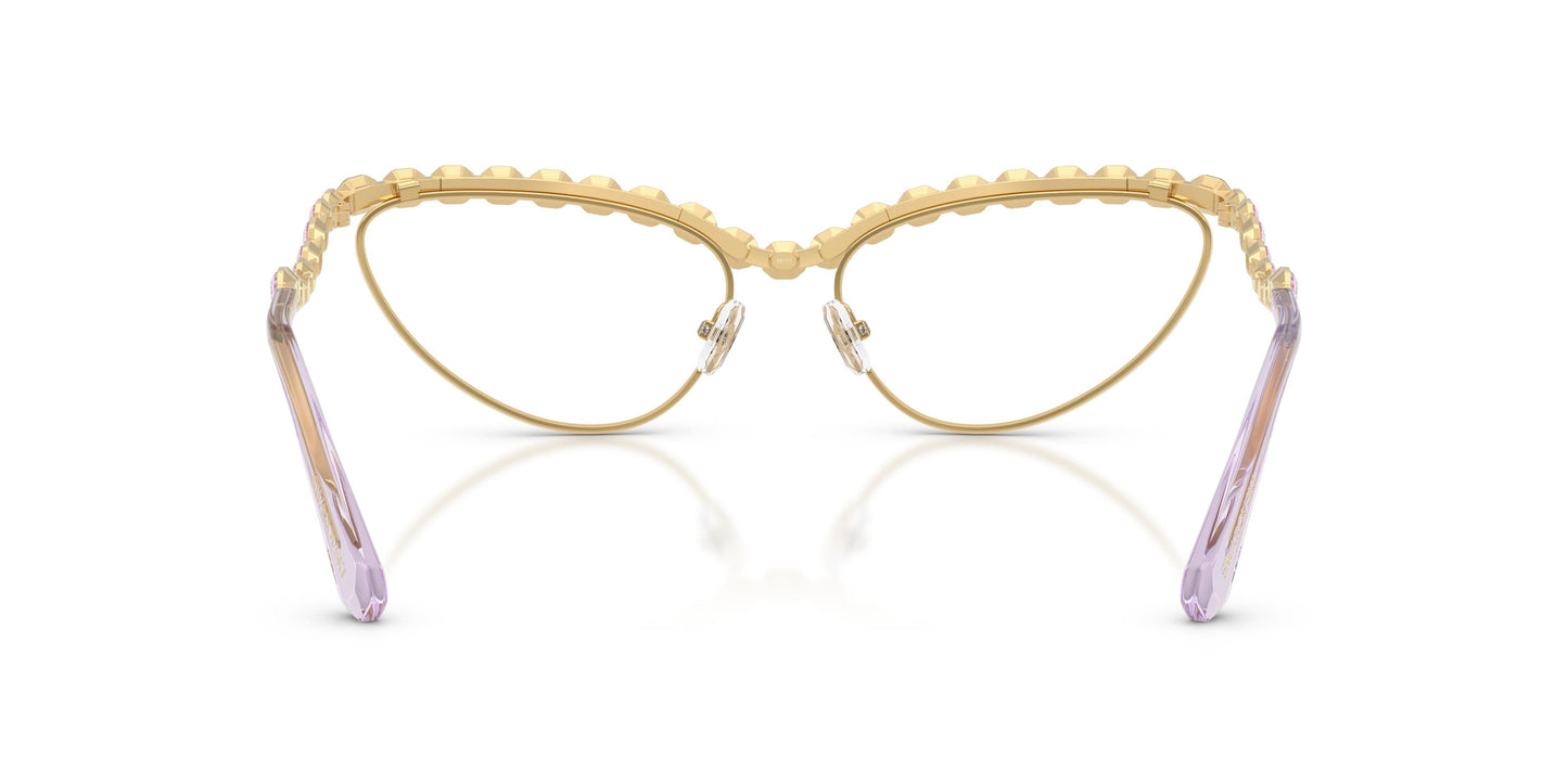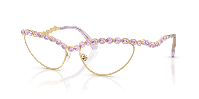 Estas monturas de ojo de gato, que encarnan el espíritu lúdico, alegre y creativo de Swarovski, se inspiran en la colección de joyería Millenia. Adornadas con cristales de corte octogonal elegantemente colocados a lo largo de la línea de las cejas y las patillas, ofrecen un complemento extraordinario a cualquier look. 37 exclusivos cristales octogonales del mismo tamaño se colocan en la barra de la ceja y en las varillas onduladas inspiradas en el icónico collar Millenia. Las monturas doradas de ojo de gato se combinan con cristales transparentes y patillas de acetato transparente o con cristales violetas y patillas lilas transparentes.