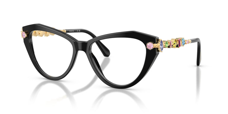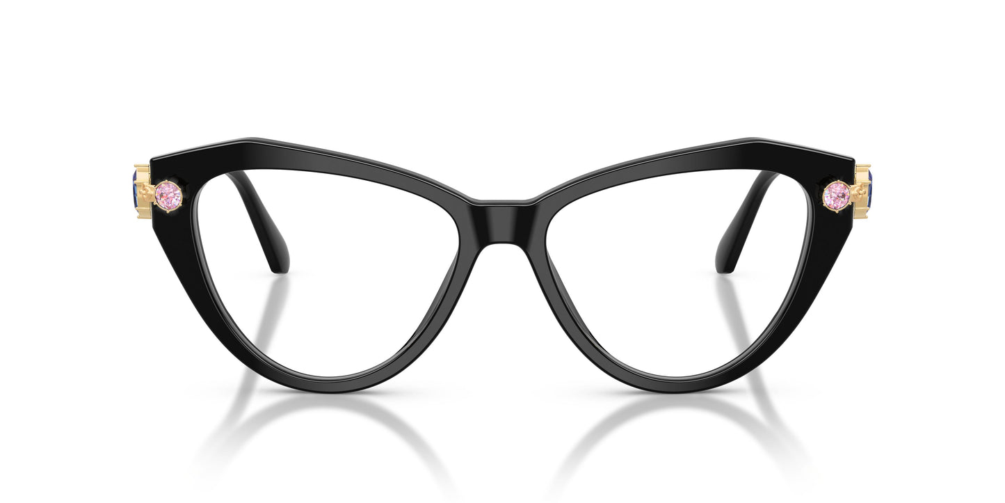 En un maravilloso despliegue de color, Swarovski crea un diseño óptico que hace girar la cabeza. Cristales inspirados en la joyería Gema en diferentes tonos de color y cortes adornan las patillas, con cristales visibles incluso en las esquinas exteriores del frente de acetato del ojo de gato, creando un look edificante lleno de alegría y sofisticación. Cristales de color caramelo o cristales en tonos verdes o azules adornan la sección metálica de las patillas y una parte del frente cat-eye. Un modelo óptico de acetato con patillas de metal adornadas con cristales y terminales de acetato donde se encuentra el logotipo de Swarovski.