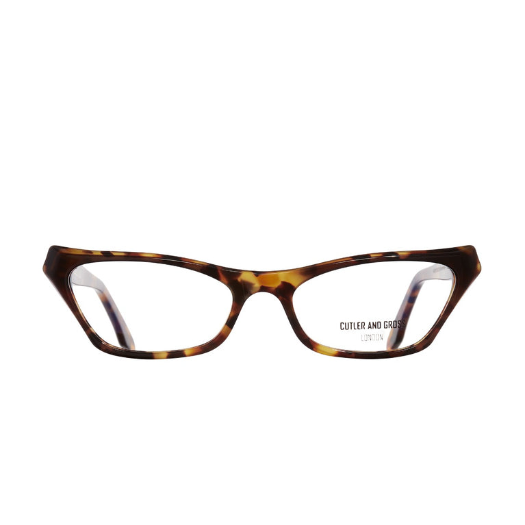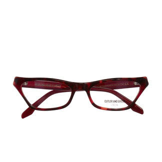 Monture optique œil de chat contemporaine en acétate, au design facetté, couleur écaille de tortue rouge. L'intérieur de la monture est spécialement usiné pour un design unique et un ajustement parfait. La monture est de base 4 avec des verres de démonstration antireflet ornés du logo Cutler & Gross.