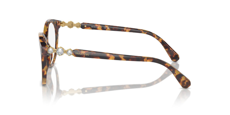 Ce modèle de lunettes présente une monture ronde en acétate inspirée des collections Constella de Swarovski. Il est orné de 3 cristaux scintillants sur chaque branche, ainsi qu'un logo élégant et discret. Acétate décliné en couleurs : noir, havane foncé et havane, ainsi que rose opale avec des cristaux rose clair et blanc opale avec des cristaux transparents assortis. Cristal Swarovski oversize entre deux plus petits sur les branches, clin d'œil aux bijoux Constella et touche scintillante parfaite pour une monture en acétate.