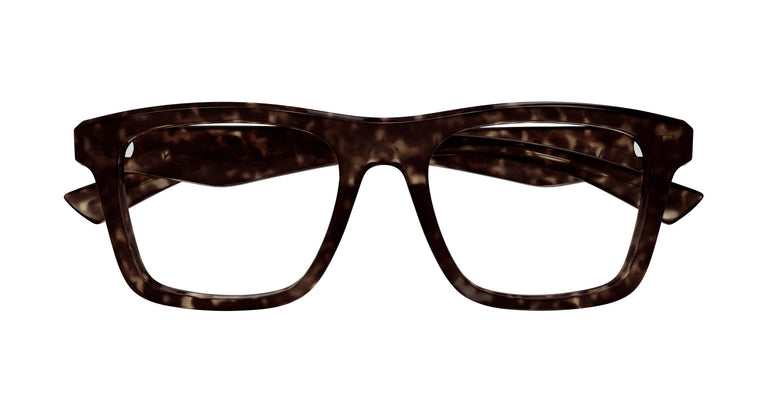 Première représentation du nouveau logo McQueen en version acétate. La barre supérieure est ornée de biseaux 3D qui confèrent aux modèles une touche de sophistication particulière. La forme rectangulaire, masculine et moderne, est caractérisée par la forme géométrique pointue des branches. Le nouveau logo McQueen est appliqué sur les branches à l'aide d'un adhésif métallique.