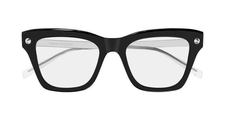Les clous, détail emblématique et pourtant reconnaissable, sont un élément clé de la marque, véritable expression de la rébellion au cœur de l'esprit McQueen. La large face œil-de-chat féminine en acétate est ornée des clous à pointes emblématiques, parfaitement intégrés à la structure de la charnière, associés aux branches en métal. Le logo Alexander McQueen est gravé au laser ton sur ton sur les branches.