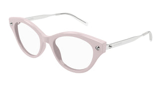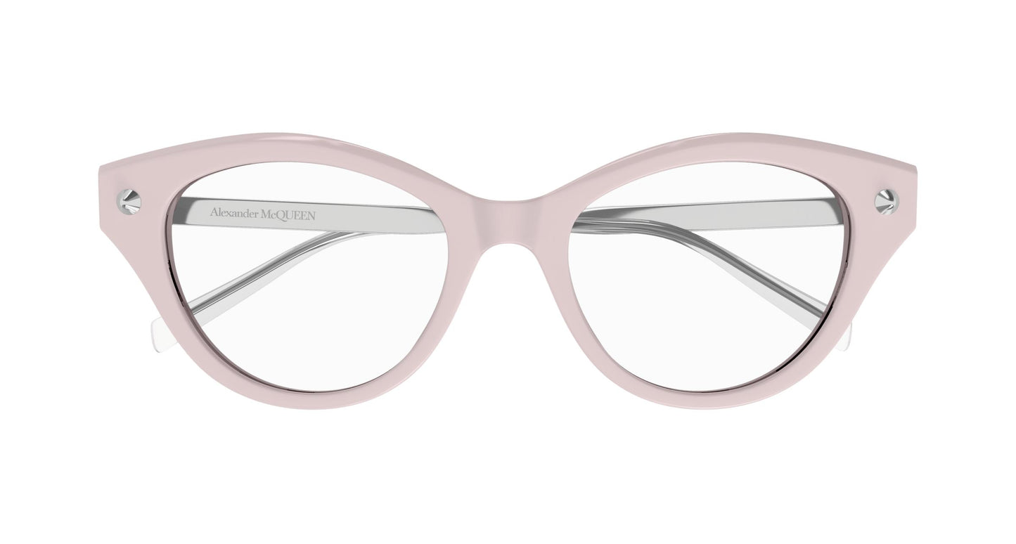 Les clous, détail emblématique et reconnaissable entre tous, sont un élément clé de la marque, véritable expression de la rébellion au cœur de l'esprit McQueen. La face féminine en acétate œil-de-chat, arrondie, est ornée des clous à pointes emblématiques, parfaitement intégrés à la structure de la charnière, associés aux branches en métal. Le logo Alexander McQueen est gravé au laser ton sur ton sur les branches.