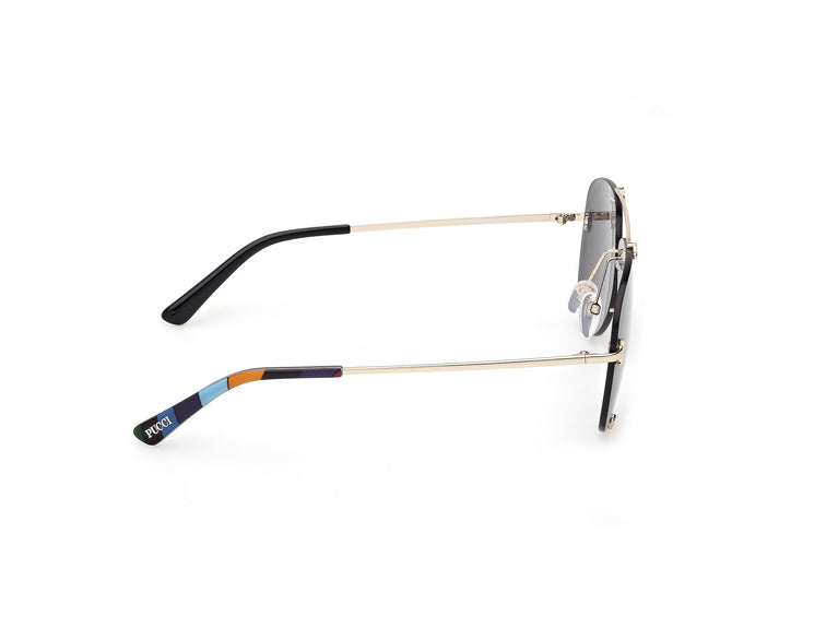Découvrez les lunettes de soleil Emilio Pucci EP0236, un chef-d'œuvre pour la femme moderne, alliant élégance et sophistication. Ces lunettes de soleil de forme pilote se distinguent par leur monture or pâle scintillante, reflétant luxe et distinction. Le pont et les branches en métal s'harmonisent harmonieusement, offrant un ajustement parfait et confortable. Les séduisants verres fumés ajoutent une touche de mystère, offrant une protection optimale sans compromettre le style. Plongez dans l'excellence avec Emilio Pucci.